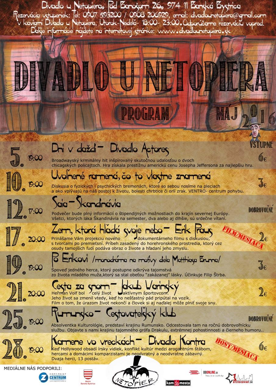 „V Divadle u Netopiera i v máji čakajú návštevníkov rôzne vystúpenia, literárne večery, predstavenia pre deti a mládež, talk show s umelcami a zaujímavými hosťami. Ponúkame aj priestor na prenájom pre spoločenské podujatia, kde sa dá stretnúť s priateľmi, na oslavu alebo firemnú aktivitu. Práve toto môže byť správnou voľbou, kde sa dá príjemne zabaviť,“