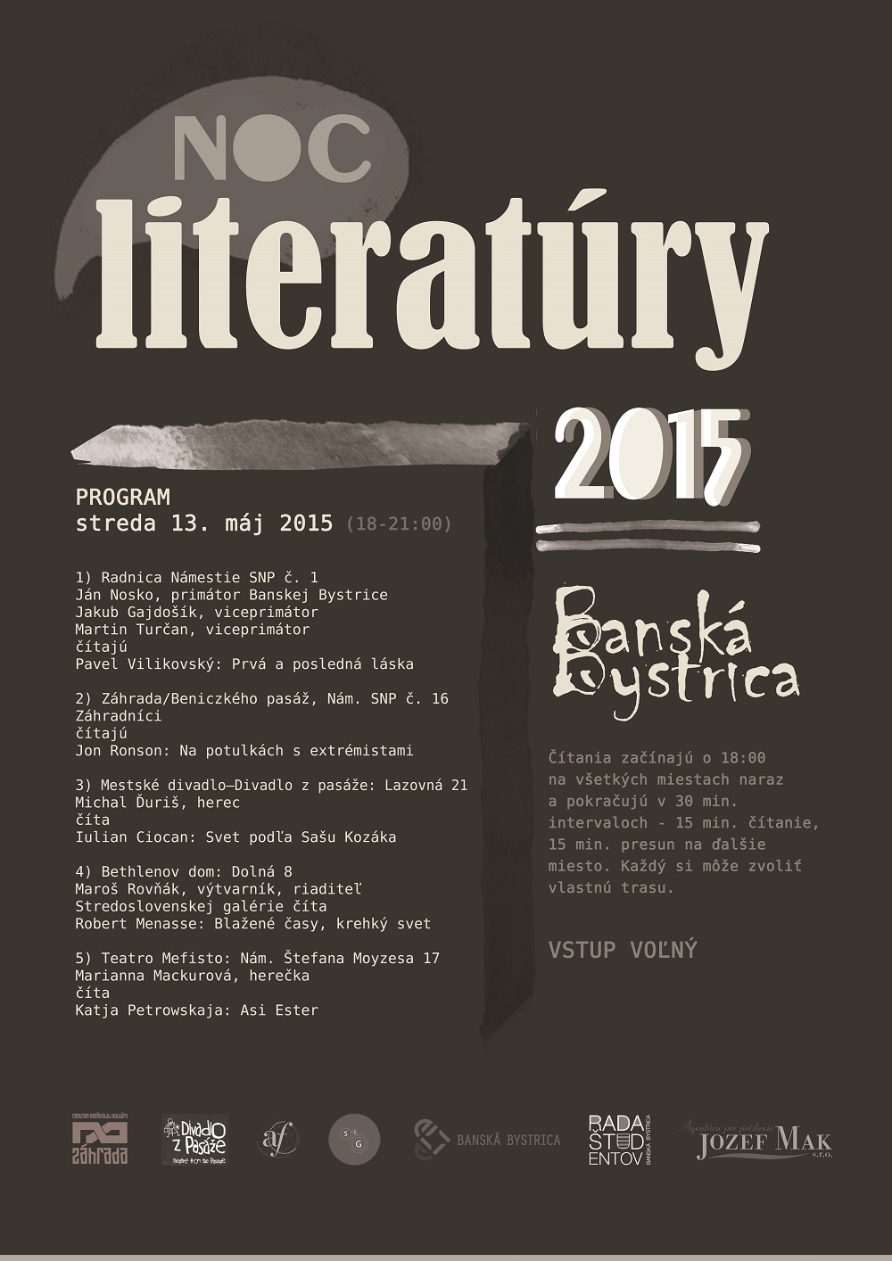 Do Banskej Bystrice sa opäť vracia jedno z najpríjemnejších jarných kultúrnych podujatí. Na miestach, kde tradične popíjame kávu, pivo, počúvame príhovory, alebo sa v nich usilovne skúša divadlo, na jeden večer zastane čas. Päť miest v centre Banskej Bystrice sa v stredu 13. mája stane dejiskom Noci literatúry 2015.