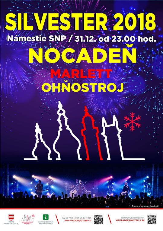 Pre tých, čo sa aj tento rok tešia na oslavy Silvestra, mesto pripravilo koncert skupiny Nocadeň so začiatkom o 23:00 hod. Po polnoci zahrá do Nového roka 2019 banskobystrická kapela Marlett.