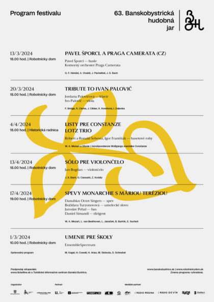 V stredu 20. marca 2024 o 18:00 hod. pokračuje festival klasickej hudby – 63. ročník Banskobystrickej hudobnej jari svojím druhým koncertom Tribute to Ivan Palovič. Venovaný bude okrúhlym výročiam narodenia aj predčasného úmrtia popredného slovenského klavírneho virtuóza Ivana Paloviča.
