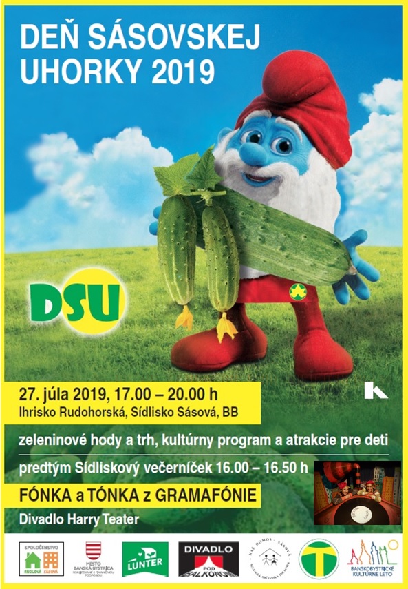 Sobotňajší podvečer 27. júla 2019 od 17:00 – 20:00 hod. bude na sásovskom ihrisku Rudohorská patriť „Sásovskej uhorke 2019“. Už od 16:00 hod. sa začína Sídliskovým večerníčkom – predstavením Fónka a Tónka z Gramofónie domáceho Divadla pod balkónom (Divadlo Harry Teater) priamo pod holým nebom.
