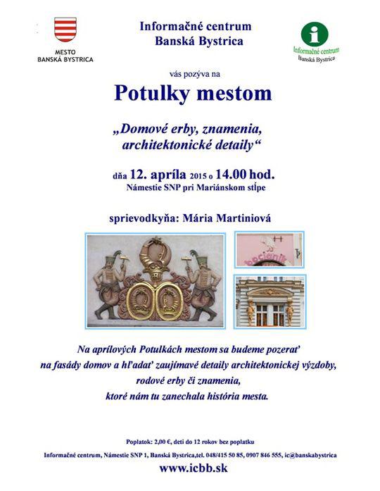Stretnutie je tradične  v nedeľu 12. apríla 2015 o 14:00 hod. na Námestí SNP pri Mariánskom stĺpe. Sprevádzať vás bude sprievodkyňa pani Mária Martiniová. Spoločne  ňou sa budete pozerať na fasády domov a hľadať zaujímavé detaily architektonickej výzdoby, rodové erby či znamenia, ktoré nám tu zanechala história mesta.