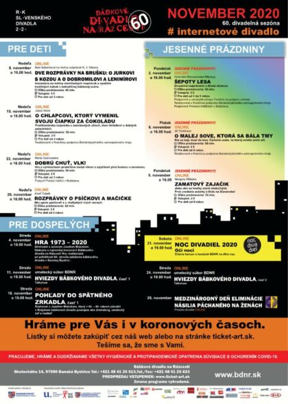 Jedinou zmenou je online prostredie. Divadlo myslelo aj na aktuálnu situáciu, konkrétne špecificky rozvrstvené jesenné prázdniny. Každý deň počas nich BDNR uviedlo inú inscenáciu. Program bol zostavený tak, aby sa v ňom vyskytovali najmä nové tituly Bábkového divadla na Rázcestí.  I preto sa jesenné prázdniny začali premiérou hry Jozefa Mokoša s názvom Hra pod režijným vedením Mariána Pecka.