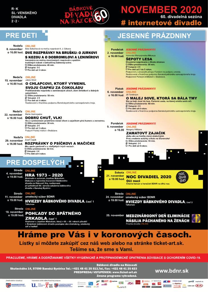 Jedinou zmenou je online prostredie. Divadlo myslelo aj na aktuálnu situáciu, konkrétne špecificky rozvrstvené jesenné prázdniny. Každý deň počas nich BDNR uviedlo inú inscenáciu. Program bol zostavený tak, aby sa v ňom vyskytovali najmä nové tituly Bábkového divadla na Rázcestí.  I preto sa jesenné prázdniny začali premiérou hry Jozefa Mokoša s názvom Hra pod režijným vedením Mariána Pecka.
