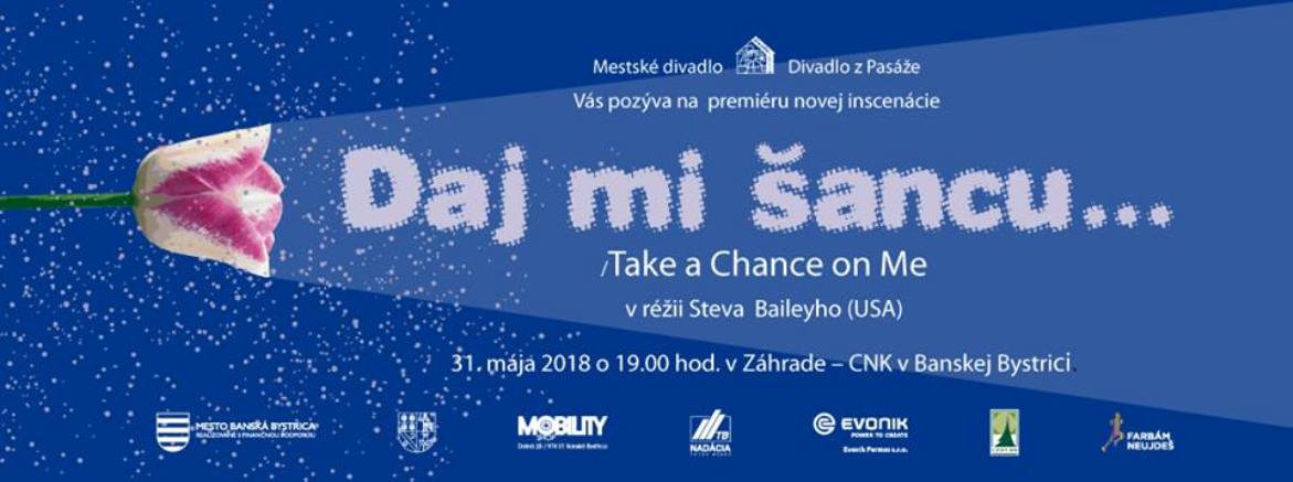 Výnimočná autorská inscenácia s názvom „Daj mi šancu…” vznikla v réžii amerického tvorcu Steva Baileyho. Aj preto sa uvádza s podtitulom „Take a Chance on Me” – s nepriamym odkazom na tému oslobodenia, vnútorného i spoločenského, ktoré sa výrazne prejavilo v 60 – tych a 70 – tych rokoch nielen v USA, ale aj inde vo svete. Premiéra sa uskutoční vo štvrtok 31. mája 2018 o 19:00 v kultúrnom centre Záhrada (Námestie SNP 15 – Beniczkého pasáž).