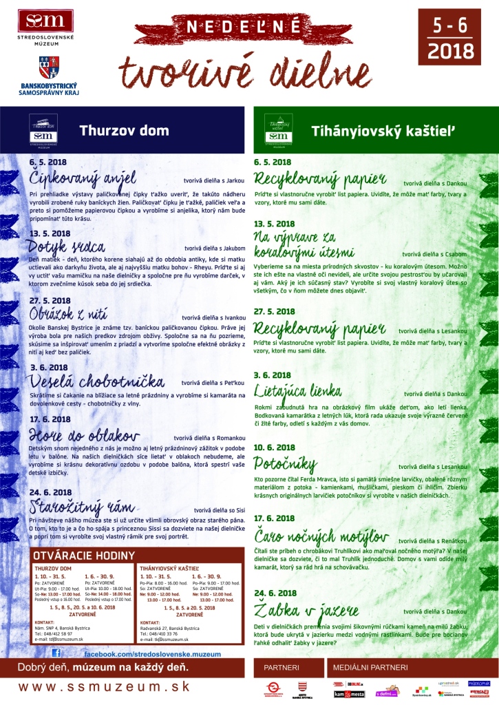 V Thurzovom dome si môžu maminky so svojimi ratolesťami vyrobiť nezabudnuteľný darček pri príležitosti Dňa matiek na tvorivej dielni s Jakubom alebo spoznať krásu baníckej a roľníckej čipy na výstave Trpezlivosť čipky prináša či odhaliť tajomstvá nástenných malieb vo vzácnej Zelenej sieni (počas otváracích hodín od 13:00 do 17.00 hod.).
