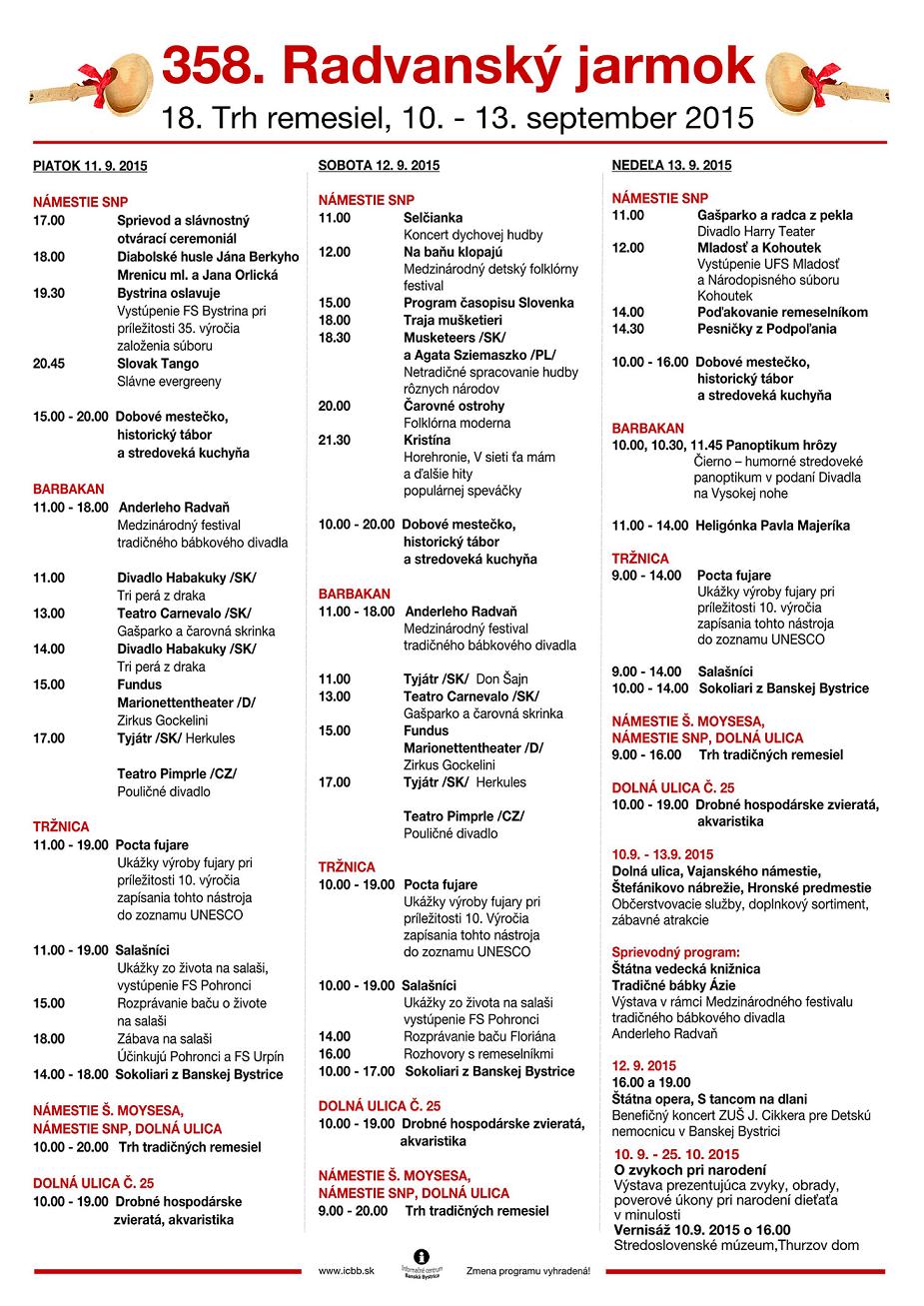 Tohto roku o bude už 358.Radvanský jarmok, ktorý sa uskutoční v dňoch 11.-13.septembra. Na Námestí SNP budeme sláviť 760. výročie udelenia mestských práv. Vrátime sa o niekoľko storočí dozadu, kde vytvoríme ilúziu dávnych čias vybudovaním stredovekého mestečka, v ktorom nebudú chýbať šermiarske turnaje, stredoveká krčma.