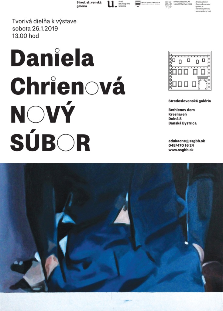 Stredoslovenská galéria Vás pozýva na sobotňajšiu tvorivú dielňu k výstave malieb Daniely Chrienovej NOVÝ SÚBOR. Táto akcia pre verejnosť sa začne v sobotu 26. januára 2019 o 13:00 hod. v Kresliarni Bethlenovho domu na Dolnej 8 v Banskej Bystrici.