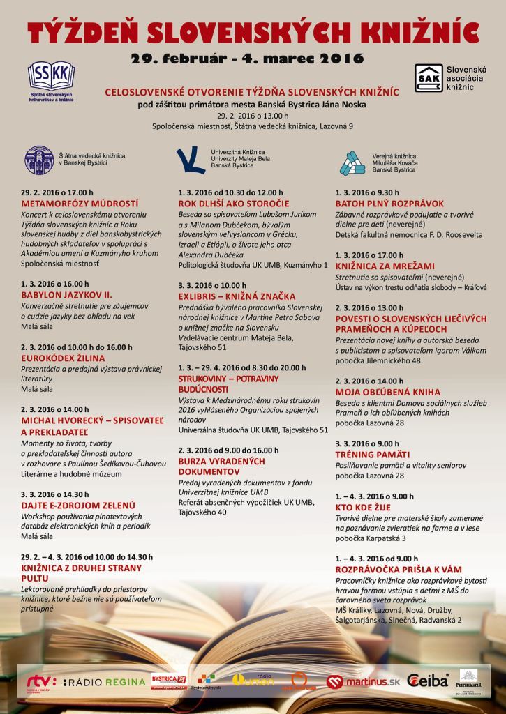 Uskutoční sa v pondelok 29. februára 2016 o 13:00 hod. v banskobystrickej Štátnej vedeckej knižnici. Ďalšími spoluorganizátormi slávnostného otvorenia Týždňa slovenských knižníc sú Verejná knižnica Mikuláša Kováča v Banskej Bystrici a Univerzitná knižnica Univerzity Mateja Bela v Banskej Bystrici. Slávnostné otvorenie sa uskutoční za účasti zástupcov Ministerstva kultúry SR, Ministerstva školstva, vedy výskumu a športu SR, Združenia miest a obcí Slovenska, Magistrátu mesta Banská Bystrica, zriaďovateľov knižníc, zástupcov knihovníckych profesijných združení a knižníc všetkých typov zo všetkých regiónov Slovenska a tiež zástupcov médií.