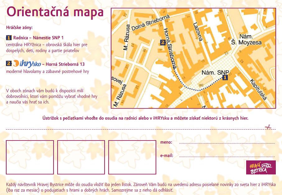Organizátori v spolupráci s mestom Banská Bystrica a banskobystrickou Radou študentov pripravili pre vás na deň plný spoločenských hier a zábavy. Preto sobotná prechádzka centrom mesta pod Urpínom môže mať aj hravú príchuť. Hry budú pripravené na Radnici – Námestie SNP 1 a iHRYsku – Horná Strieborná 13 od 10:00 do 18:00 hod.