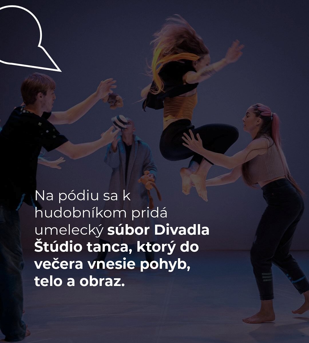 Na pódiu sa k hudobníkom pridá umelecký súbor Divadla Štúdio tanca, ktorý do večera vnesie pohyb, telo a obraz. Spoločne vytvoria improvizovanú performatívnu kompozíciu – živé stretnutie hudby a tanca, ktoré sa zrodí priamo pred očami divákov.