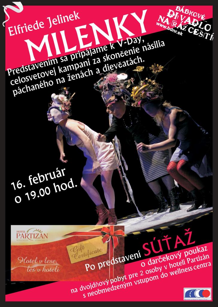 Okrem toho, že svojou návštevou podporíte dobrú vec. Máte jedinečnú príležitosť vyhrať luxusný wellness pobyt pre dve osoby v hotely Partizán, v rámci súťaže organizovanej po predstavení. Elfriede Jelinek, Milenky, V-Day a Vaša šanca na wllness oddych, 16. februára o 19:00 hod. v sále BDNR. Milenkami však výnimočné zážitky v BDNR nekončia!