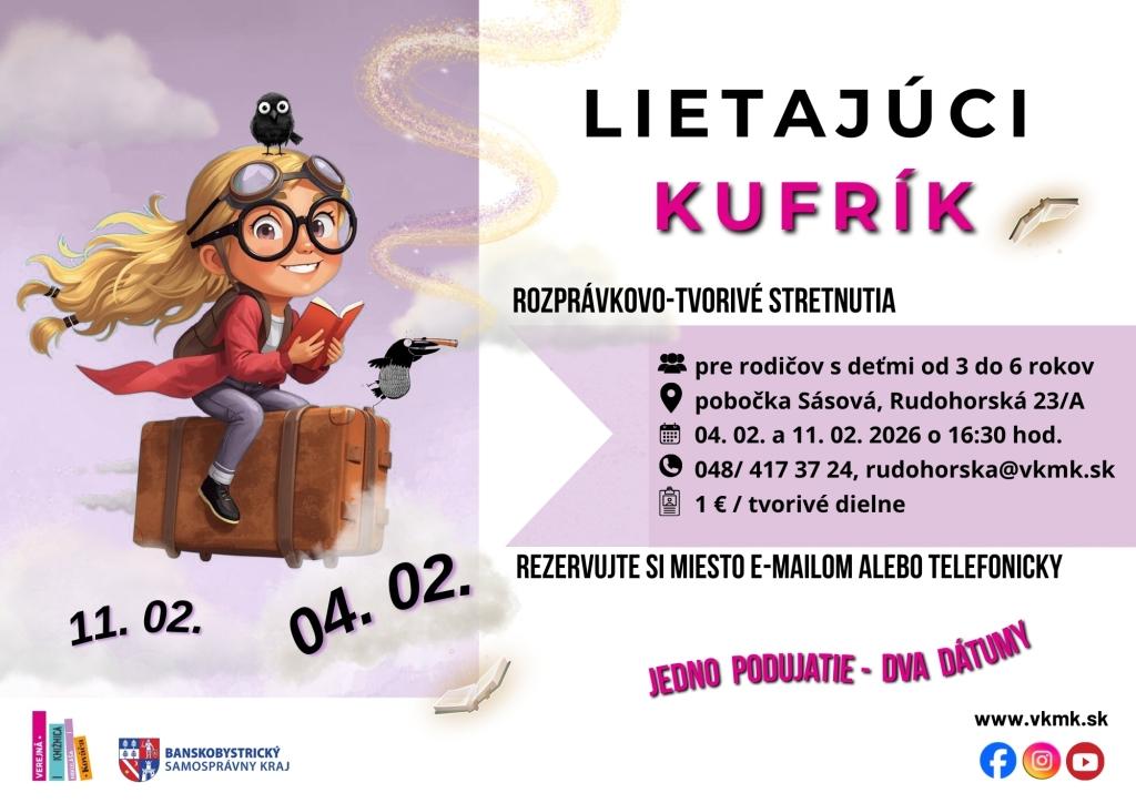 - 11. 2. o 16:30: Lietajúci kufrík (pob. Sásová) – cestovanie svetom príbehov.