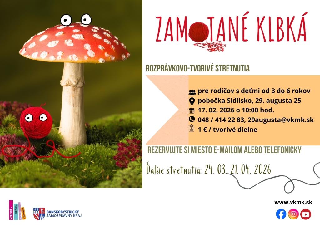 - 17. 2. o 10:00: Zamotané klbká (pob. Sídlisko) – tvorivé čítanie pre jemnú motoriku.