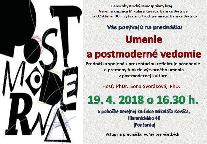 BBSK, Verejná knižnica Mikuláša Kováča v Banskej Bystrici Knižnica a OZ Ateliér 3 G – výtvarníci troch generácií pripravili zaujímavú prednášku  Umenie a postmoderné vedomie. Uskutoční sa vo štvrtok 19. apríla 2018 o 16:30 hod. v pobočke VKMK na Fončorde, Jilemnického ulica 48.