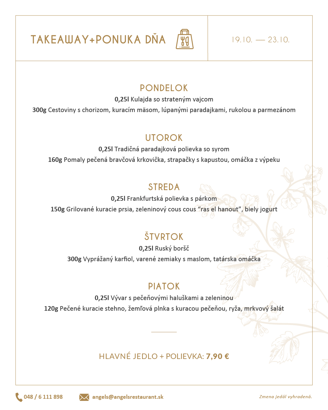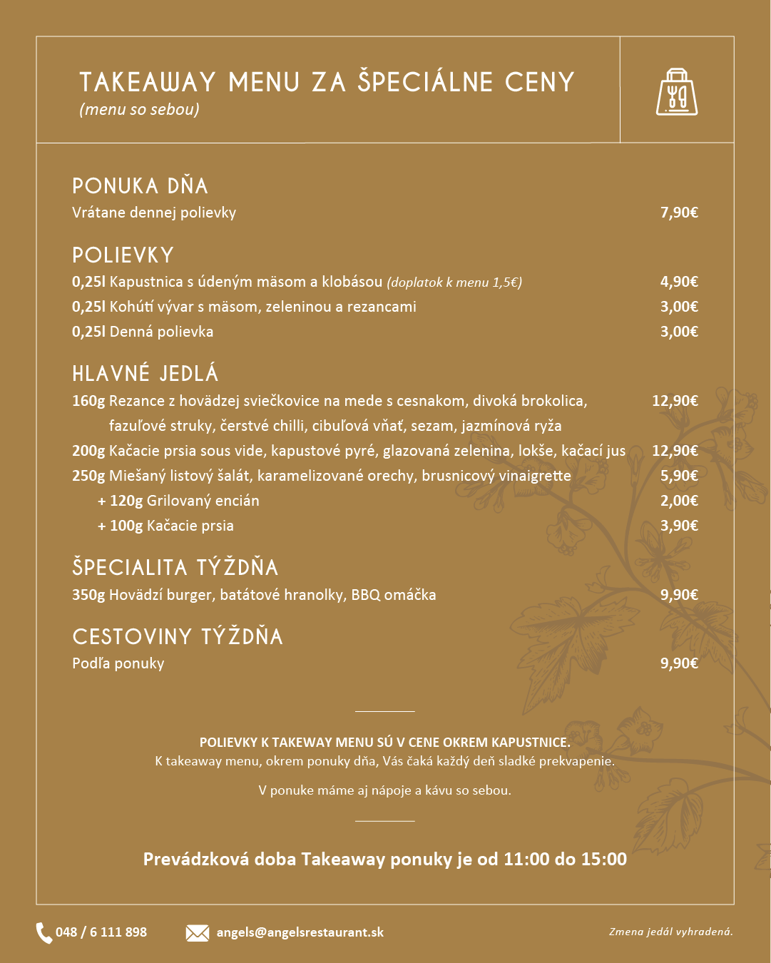 Prevádzková doba TAKEAWAY ponuky je od 11:00 do 15:00 hod. Objednávky prijímame osobne, telefonicky alebo prostredníctvom e-mailu. Navyše od pondelka si u nás zakúpite čerstvé pečivo a chlieb. Viac na www.angelsrestaurant.sk.