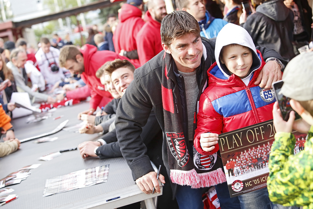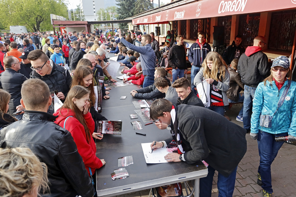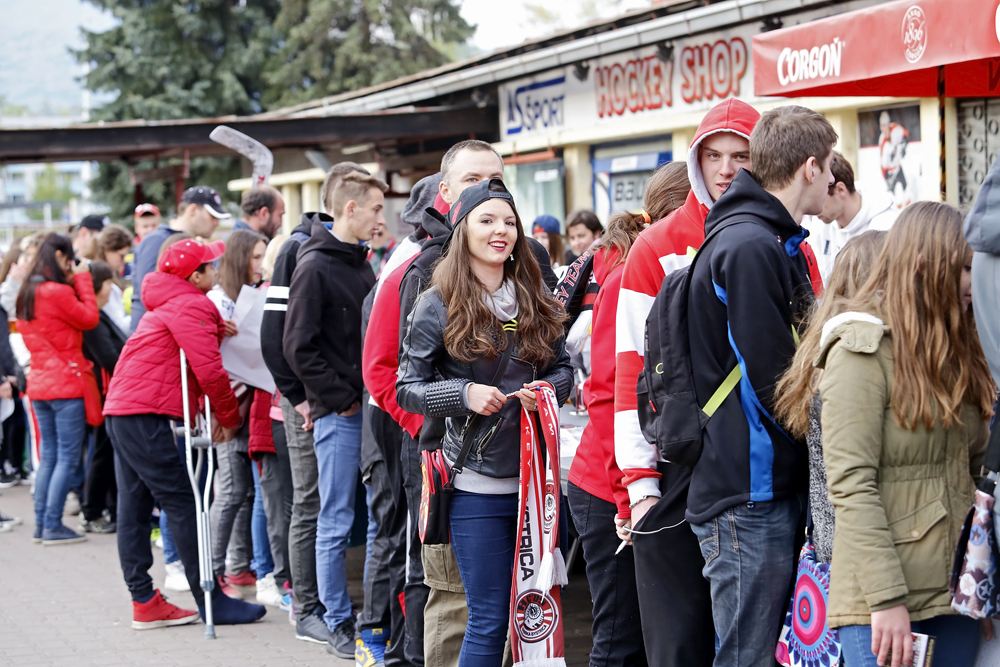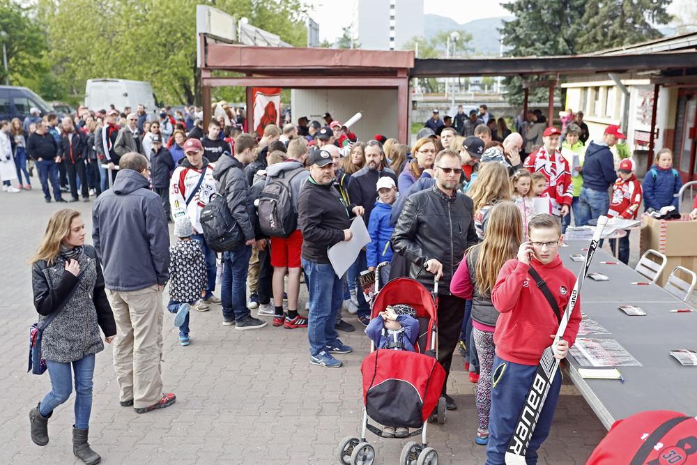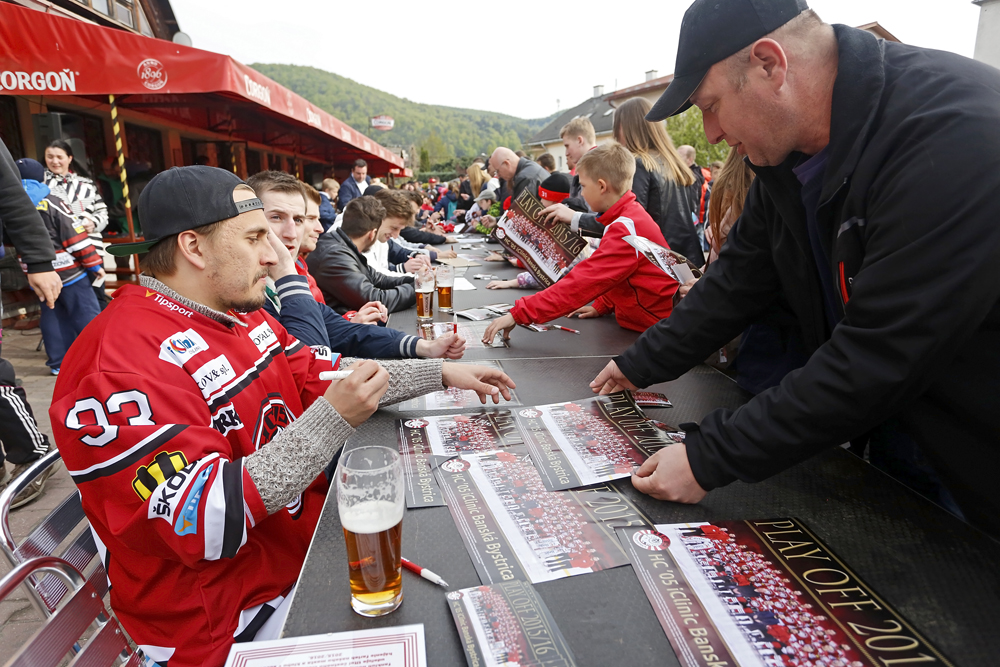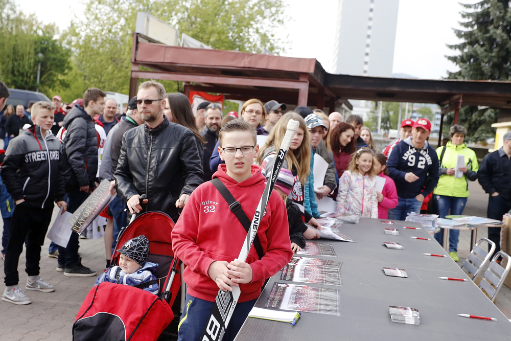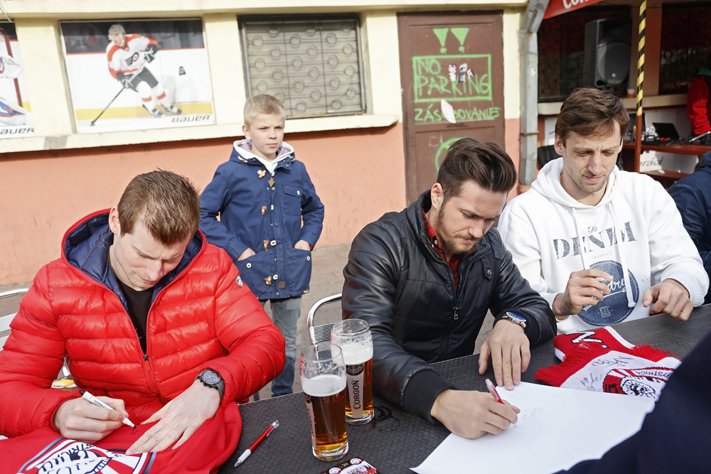 Rad fanúšikov, ktorý akoby nemal konca, sa pohol po piatej, keď si za stoly s perami a fixkami sadli hráči HC´05 iClinic Banská Bystrica. Okrem podpisov „barani“ rozdávali aj nekonečné úsmevy, najmä keď sa so svojimi priaznivcami fotili. Záujem o spoločné foto bol obrovský.
