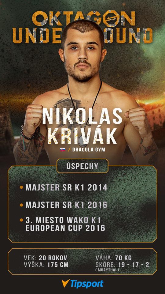 „Nikolas je na svoj vek (20 rokov) už skúsený a pokorný bojovník vyznávajúci tradičné hodnoty Muaythai. Nie je však klasická 70 – ka, ako je vypísaná váha tejto pyramídy. Bežne zápasí 63,5 ku alebo 67 kg, takže môže bez problémov zvládnuť i vyššiu váhovú kategóriu a ešte mu zostane aj rezerva. Držte nám palce ideme do toho.“