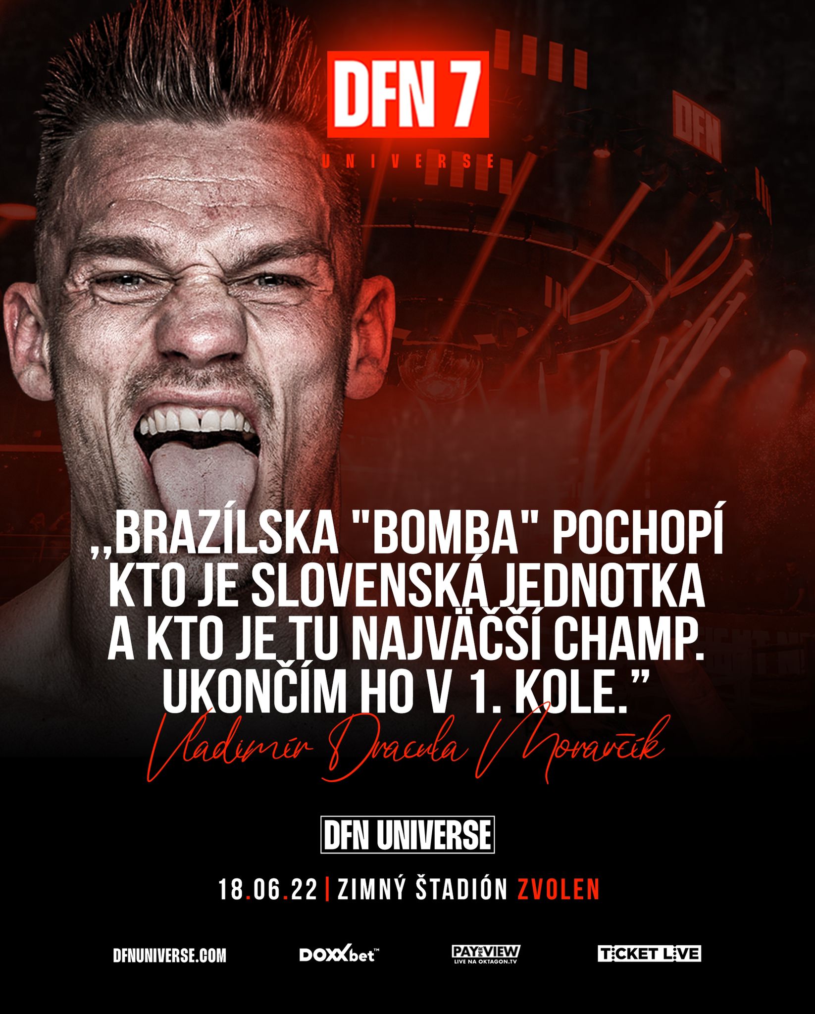 Po siedmich rokoch sa na domácu scénu vracia legenda bojových športov a 11-násobný šampión viacerých svetových prestížnych organizácii Vladimír „Dracula“ Moravčík, ktorý zo svojich 95 profesionálnych zápasoch vyhral 84, v dvoch remizoval a len deväť prehral. Jeho súperom bude v boji v klietke podľa pravidiel thajského boxu v malých MMA rukaviciach trojnásobný brazílsky šampión Joao Paulo „Bomba“ de Carvalho. Ten doposiaľ absolvoval 35 profesionálnych zápasov, pričom 29 vyhral, dva remizoval a iba štyrikrát prehral.