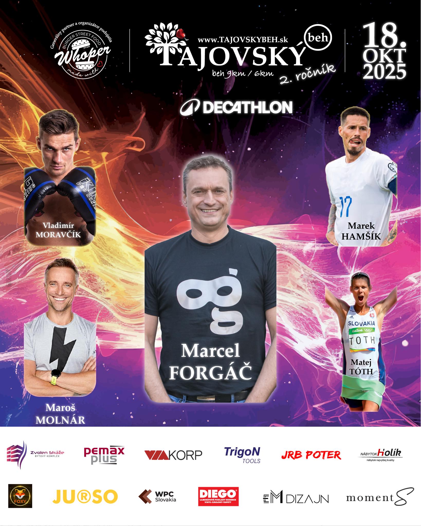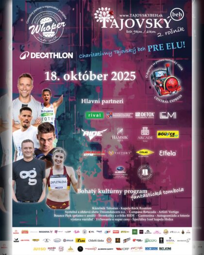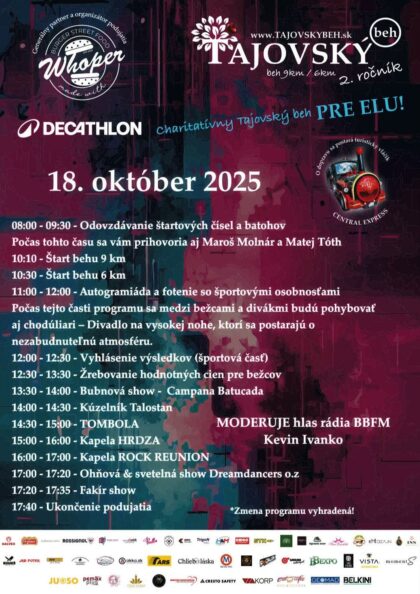 Zároveň, každý, kto sa zaregistruje, automaticky získa vstupenku na URPÍN FEST, ktorý sa uskutoční rovnako 18. októbra 2025 v Tipsport Aréna v Banskej Bystrici. Vystúpia kapely ako: Kmeťoband, Vidiek, Hex, Heľenine oči či No Name. Všetky dôležité informácie, vrátanie registrácie sú dostupné na: www.tajovskybeh.sk Zmena programu vyhradená.