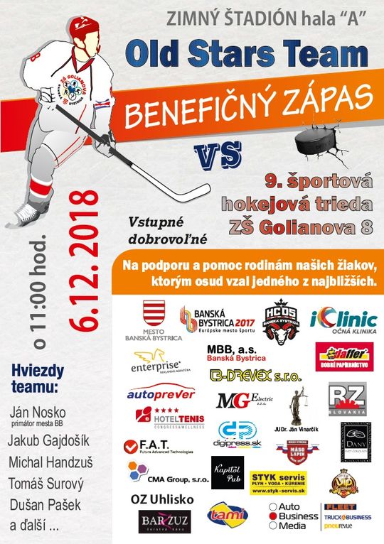 Vlani, keď ZŠ Golianova oslavovala 50. výročie založenia prvej hokejovej triedy v bývalom Československu, zvíťazil Old Stars Team 15:11. O výsledok však nešlo, dôležitá bola dobrá nálada a príjemný športový zážitok, ale aj naplnenie benefičného cieľa.