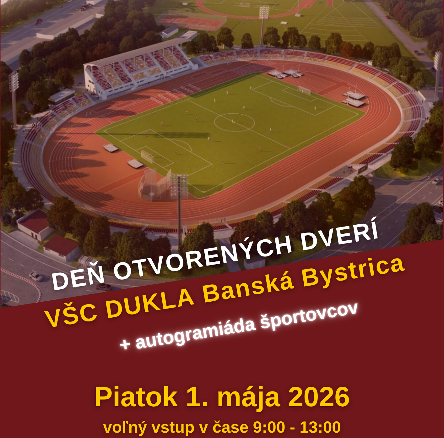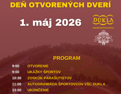 Deň otvorených dverí VŠC DUKLA Banská Bystrica sa bude konať v piatok 1. mája 2026 na Atletickom štadióne SNP Dukla na Štiavničkách v čase od 9:00 do 13:00 hodiny.