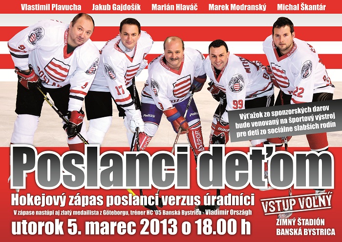 Na banskobystrickom zimáku začne priateľský hokejový zápas medzi poslancami a úradníkmi v utorok 5.marca 2012 o 18:00 hod. Nastúpi v ňom aj zlatý medailista z Göteborgu a tréner „Baranov“ HC´05 Banská Bystrica Vladimír Országh. V drese poslancov diváci uvidia elitnú päťku v zložení Vlastimil Plavucha, Jakub Gajdošík (kapitán), Marián Hlaváč, Marek Modranský a Michal Škantár.