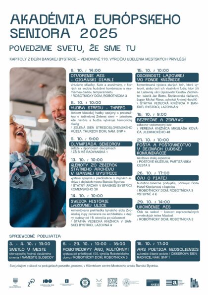 Mesto Banská Bystrica v spolupráci s partnermi pripravilo 24. ročník Akadémie európskeho seniora. Séria októbrových podujatí sa nesie v znamení 770. výročia udelenia mestských privilégií a prináša bohatú ponuku kultúrneho i športového vyžitia pre skôr narodených Banskobystričanov a Banskobystričanky.