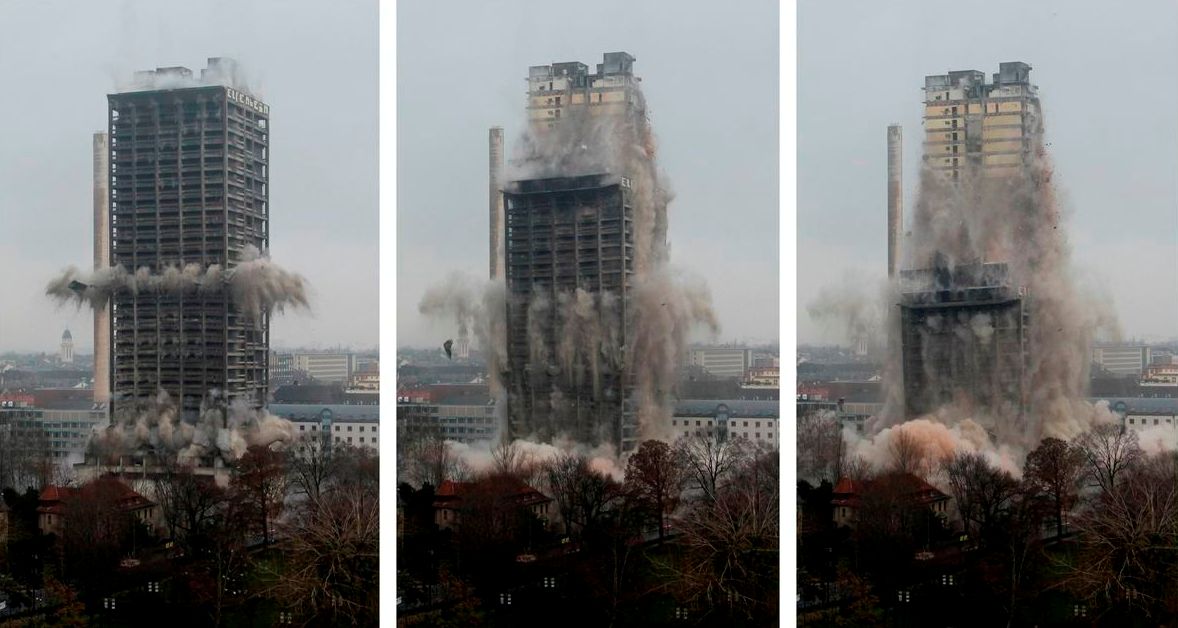 Mrakodrap sa zosypal podľa presne určeného plánu v nedeľu o 10:05 hod. Išlo o univerzitnú budovu postavenú v roku 1972 v blízkosti frankfurtského výstaviska. Pyrotechnici pod vedením strelmajstra Eduarda Reischa použili na odstrel 50-tisíc ton betónu asi tonu výbušnín.