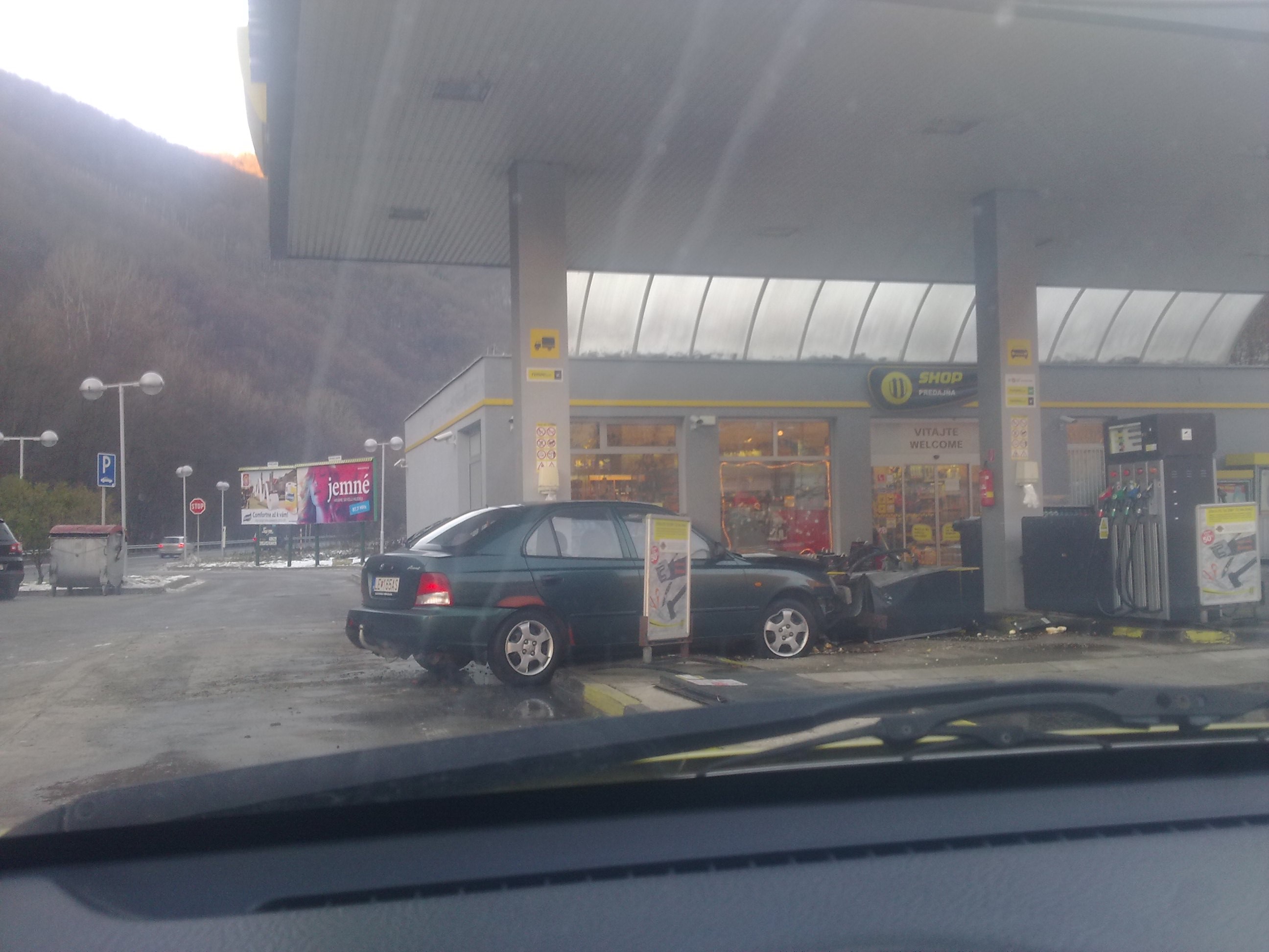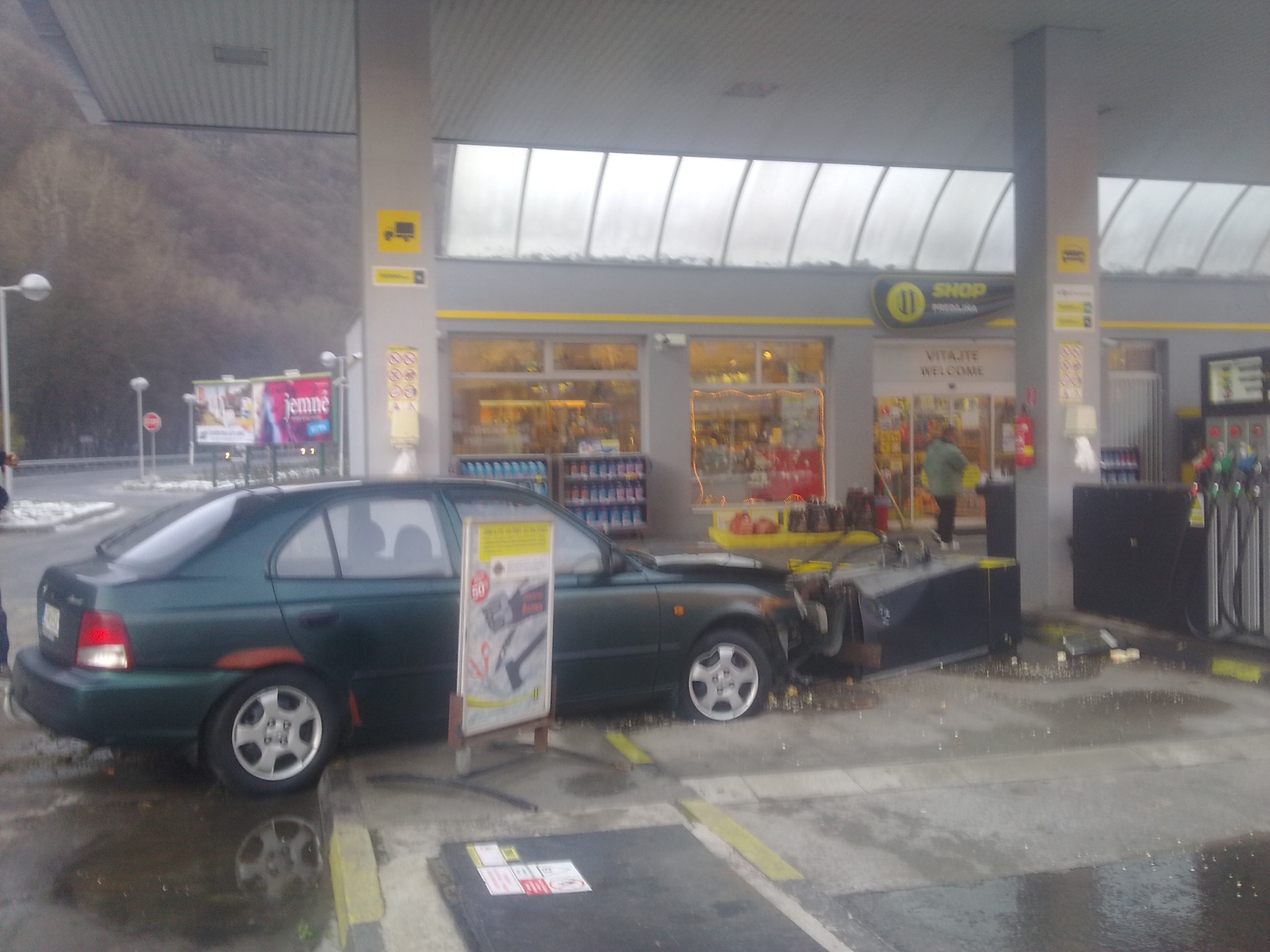 Stalo sa to vodičovi osobného auta buď po šmyku alebo požitím plynu miesto brzdy. Auto doslova zdemolovalo stojan na čerpanie pohonných hmôt. Našťastie nedošlo k úniku benzínu či nafty,  ani k nebezpečenstvu prípadného výbuchu.