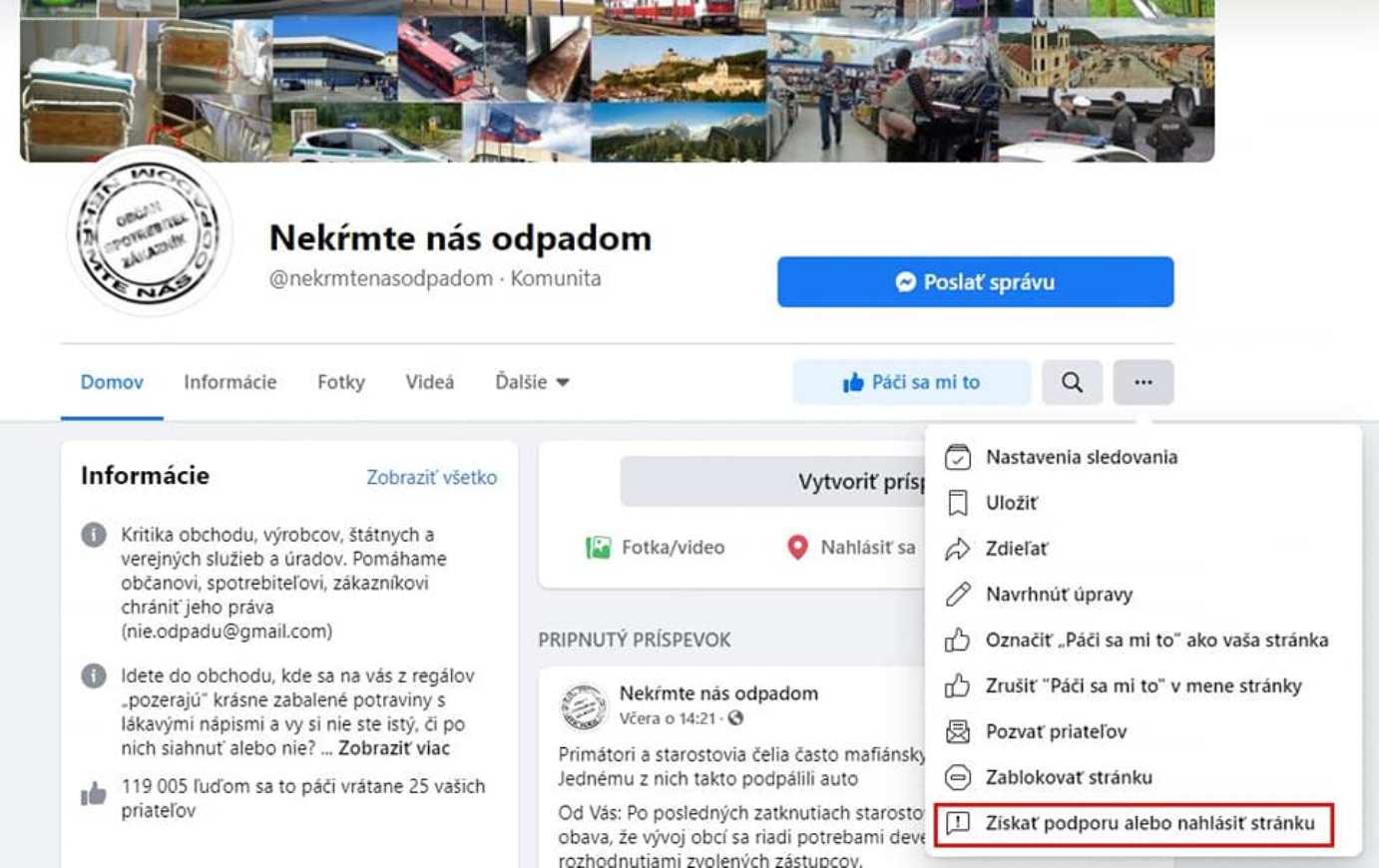 Túto stránku šíriacu falošné a neoverené informácie prosíme nahláste týmto spôsobom: Na podvodnej stránke kliknete na ikonu troch bodiek v pravom rohu pri ikonke vyhľadávania.