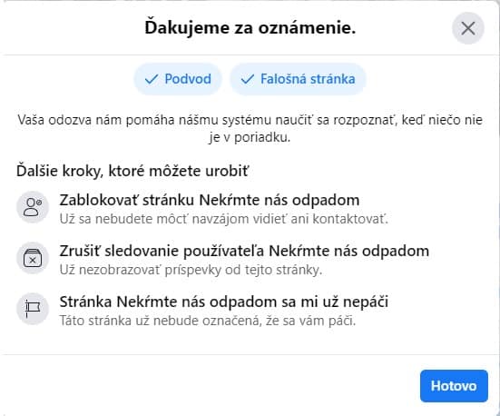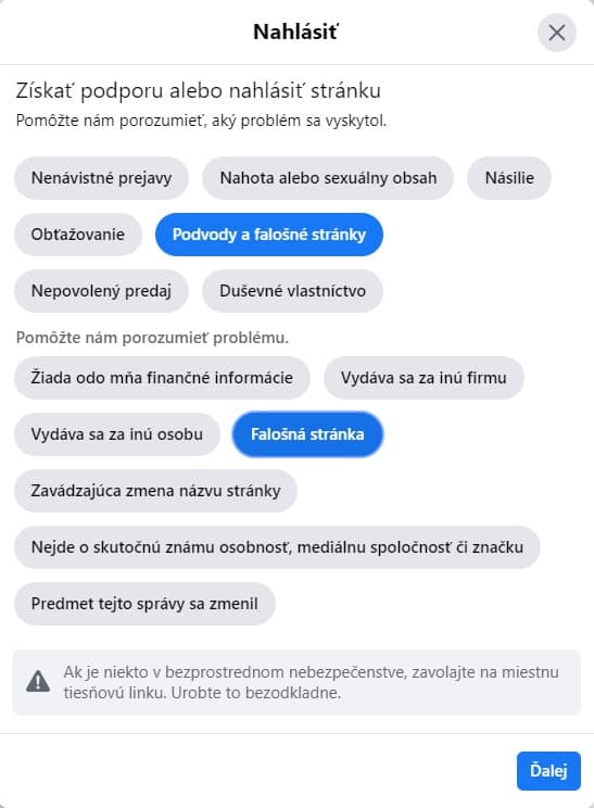 Následne vyberiete možnosť “Získať podporu alebo nahlásiť stránku”, následne zvolíte možnosť “Podvody a falošné stránky” – podmožnosť “falošná stránka“, kliknete na tlačidlo “ďalej” a potom “hotovo”.