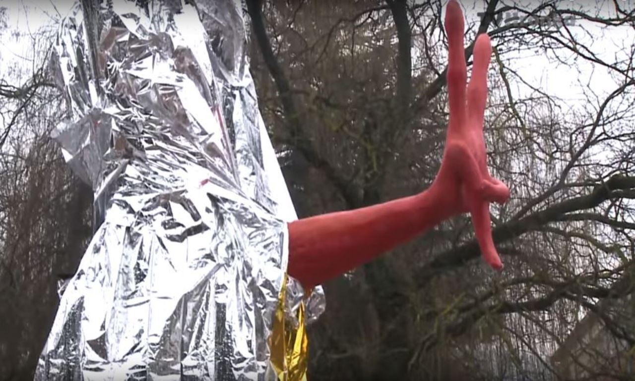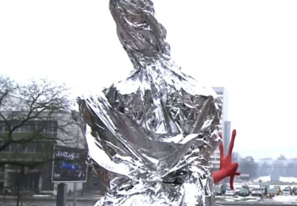 V minulých dňoch sa na podstavci objavila anonymná skulptúra „mimozemšťana“ obalená alobalom na konštrukcii, z ktorej vykúkala len ružová ruka s prstami do véčka. Okoloidúci nad tým zväčša nechápavo krútili hlavou. Nikto nevedel, kto túto anonymnú sochu na podstavec nainštaloval a čo má vyjadrovať. Nikto sa k tomuto takmer trojmetrovému „dielu“ ani nehlásil.
