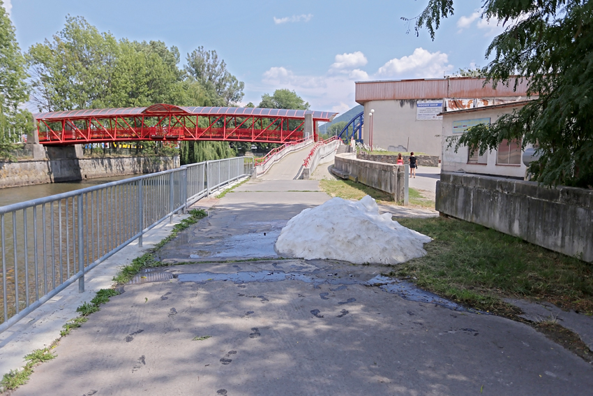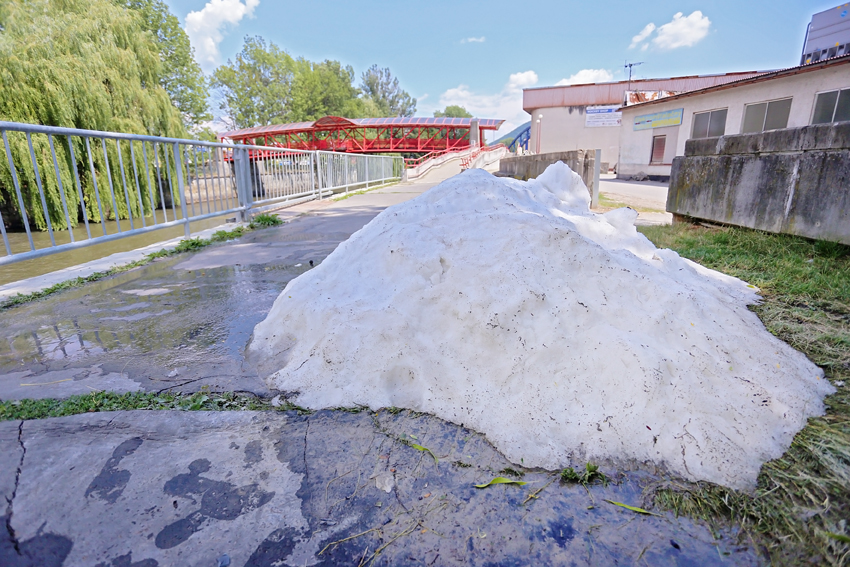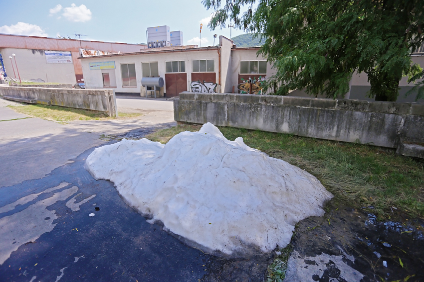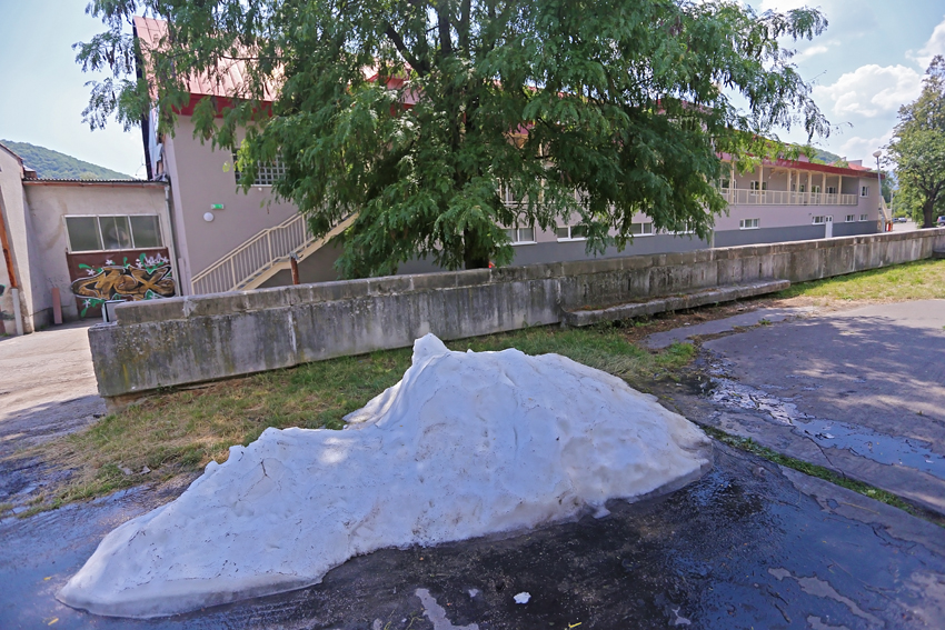 Napadlo nás to blízko zimného štadióna pri prechádzke popri Hrone, ktorý trpí nedostatkom vody. Narazili sme na kopu snehu z rolby, ktorá ho zozbierala pri čistení ľadu v hlavnej hale. Sneh sa roztápal len tak bez úžitku, ale keď sme si ho nabrali do ruky, pri teplotách nad 30 ?C to je celkom príjemné osvieženie.
