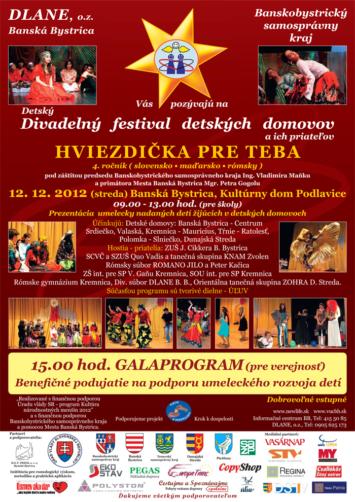 Občianske združenie DLANE v spolupráci s Banskobystrickým samosprávnym krajom a mestom Banská bystrica organizuje 4. ročník (slovensko – maďarsko – rómsky) Divadelného festivalu detských domovov a ich priateľov Hviezdička pre teba.