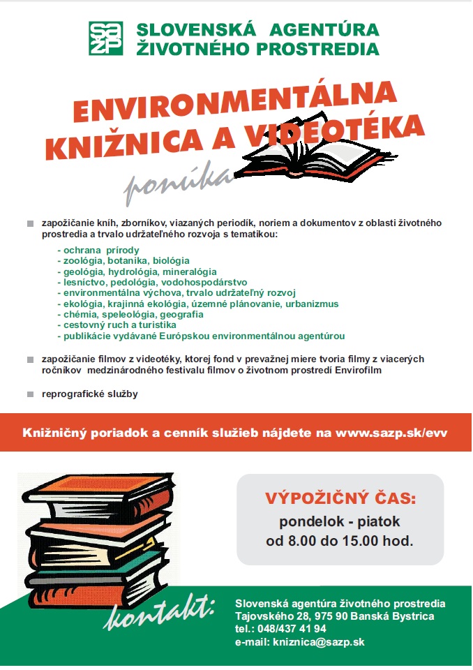 booksPráve preto Slovenská agentúra životného prostredia (SAŽP) ako rezortná organizácia Ministerstva životného prostredia Slovenskej republiky upozorňuje v tomto mesiaci na jednu zo svojich služieb poskytovaných širokej verejnosti – ponuku environmentálnej knižnice. Knižnica je špeciálne zameraná na knihy, časopisy, zborníky, dokumenty týkajúce sa životného prostredia. Ponuku viac ako 8700 titulov rozširuje bohatý archív titulov z medzinárodného festivalu filmov o životnom prostredí Envirofilm, ktorý organizuje už 19 rokov Slovenská agentúra životného prostredia. Snímky z Envirofilmu každý rok „putujú“ do knižnice, odkiaľ si ich môžu záujemcovia požičať.