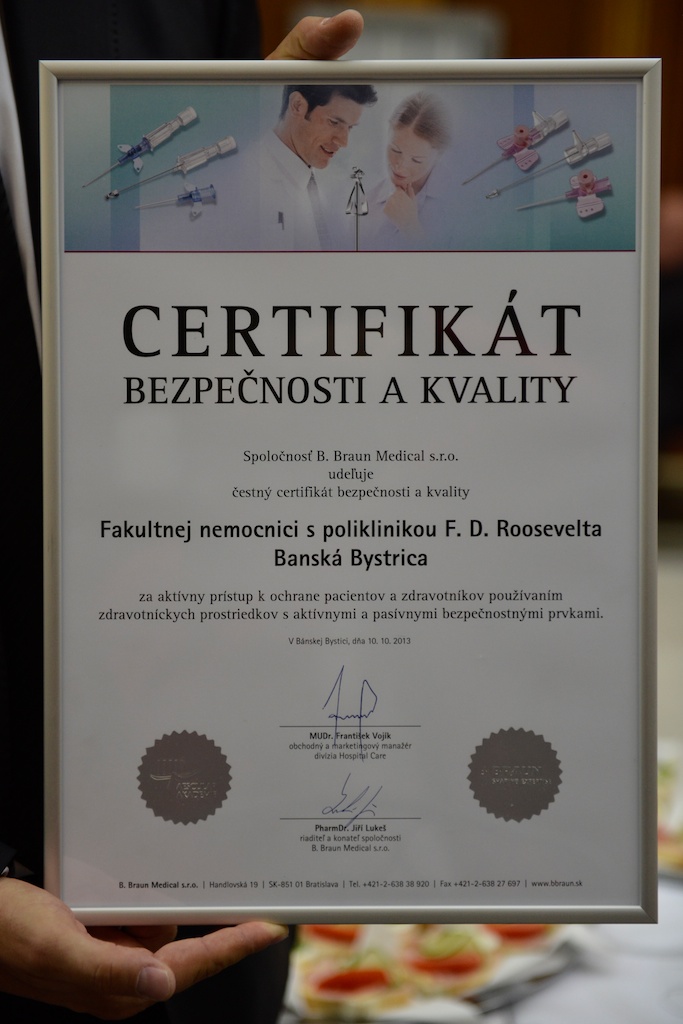 Čestný certifikát, ktorý udeľuje Skupina B. Braun od roku 2009, doteraz získalo v obidvoch krajinách 13 nemocníc. Z rúk country managera B. Braun Ing. Petra Šumichrasta ho prevzal riaditeľ nemocnice MUDr. Vladimír Baláž, PhD..