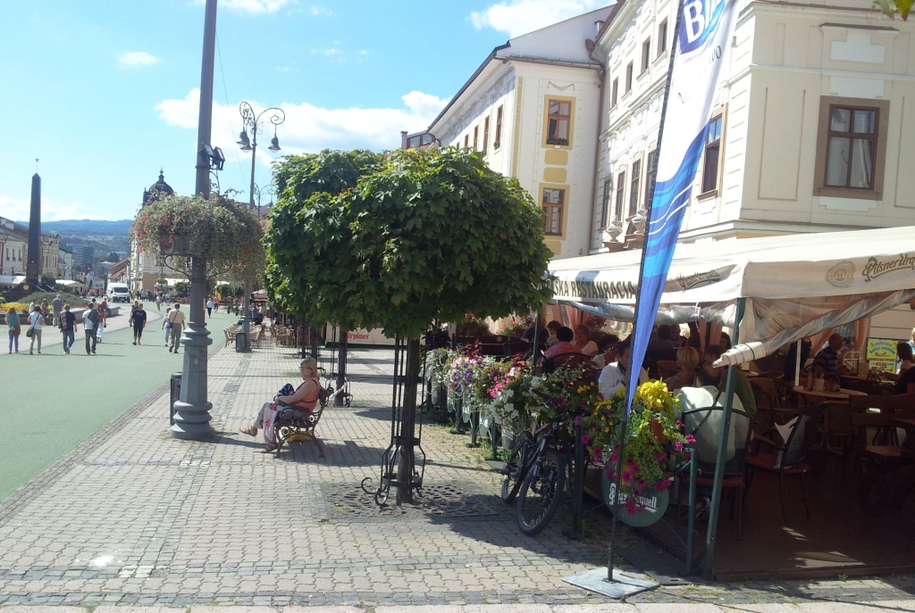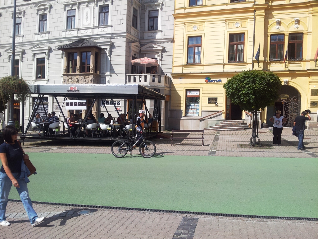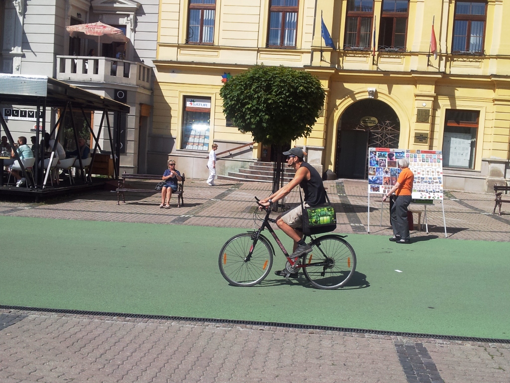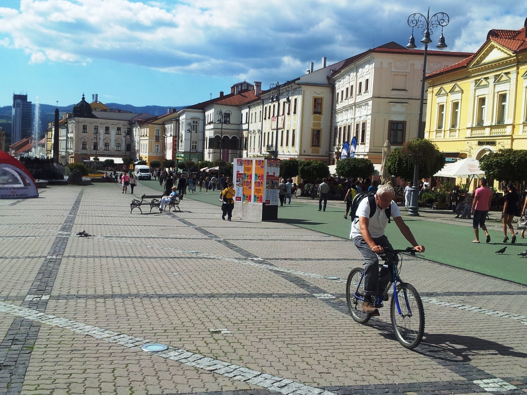 Pri stĺpe Panny Márie sme zastihli ďalšieho cyklistu, ktorý sedel na kamennom stupni s opretým bicyklom. „Celkom fajn, že môžem prejsť na bicykli aj cez námestie. Len mi tu chýbajú stojánky, kde by som si mohol bezpečne odložiť bicykel, keď chcem odbehnúť do obchodu. Aj teraz som si bol kúpiť zmrzlinu, ale stále som musel pohľadom sledovať, či mi ho niekto neukradne,“ zdôveril sa nám ďalší Bystričan Rado.