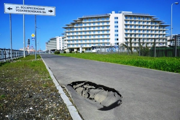 Ruský bloger Alexander Valov sa prišiel po mesiaci pozrieť na čiernomorské olympijské mestečko a neveril vlastným očiam. Sneh už dávno zmizol spolu s tisíckami olympionikov. Zostali iba opustené ulice, nedostavané obytné komplexy, na nedávno vyasfaltovaných cestách vidno diery a odpadávajúce obrubníky, niekde je len holá zem. Napokon to dokazujú jeho fotografie z miesta.
