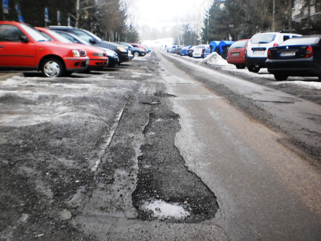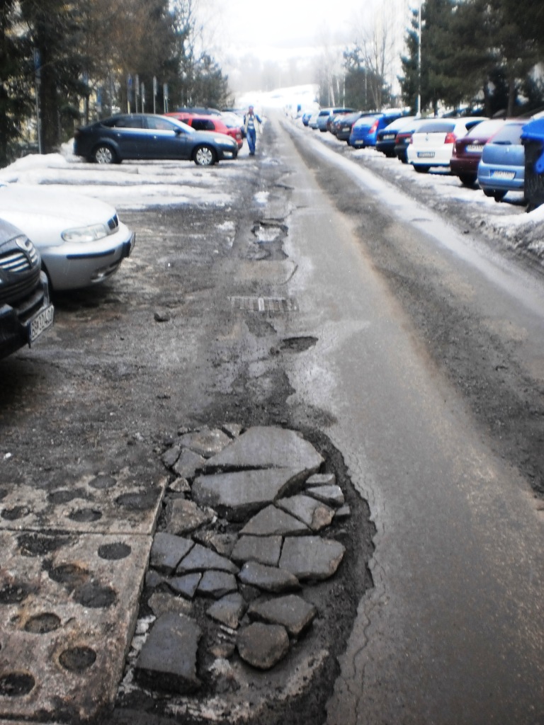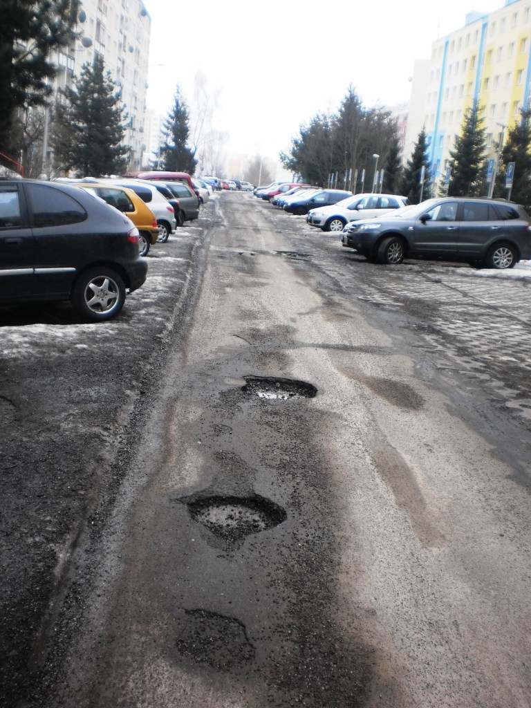 Cesta na Tatranskej ulici sa už doslova podobá na tankodrom. S množstvom výtlkov pripomína diery po granátoch z vojenského cvičenia. Ak si uvedomíme, že po tejto ceste každý deň prejdú stovky áut a tisícky ľudí, ktorí majú na riešenie tejto havarijnej a nebezpečnej situácie čakať do jari, musíme obdivovať trpezlivosť miestnych obyvateľov.