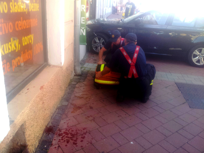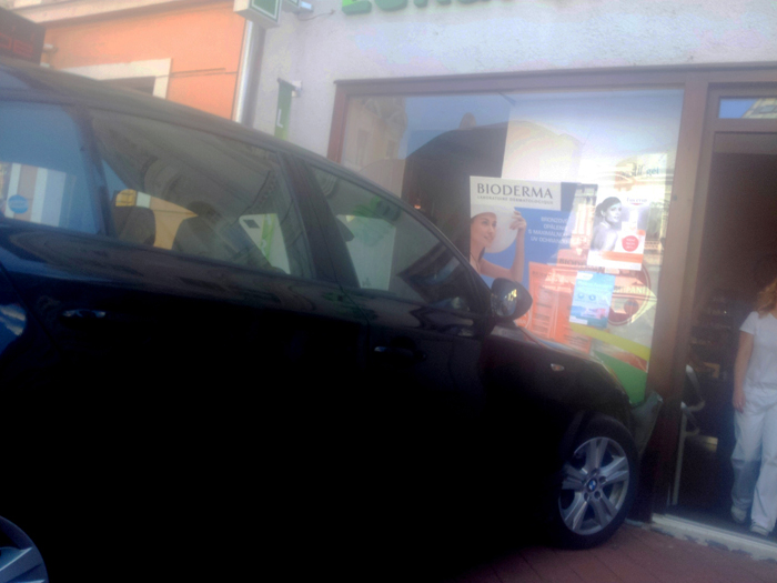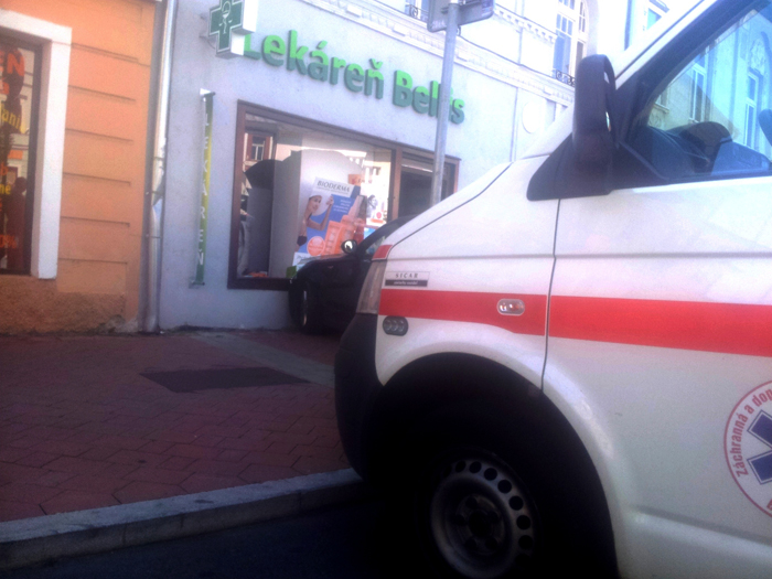 V pondelok okolo 11-tej hodiny dopoludnia zažili chodci na chodníku v blízkosti Prima banky na Hornej ulici šok. Mladá vodička na čiernom BMW nezvládla riadenie svojho vozidla. Zrejme chcela zaparkovať, avšak miesto brzdy stlačila plynový pedál. Preletela cez chodník plný ľudí a skončila vo výklade lekárne Bellis.