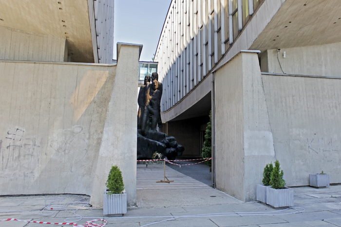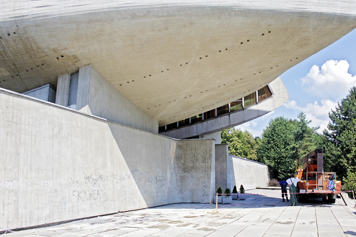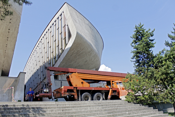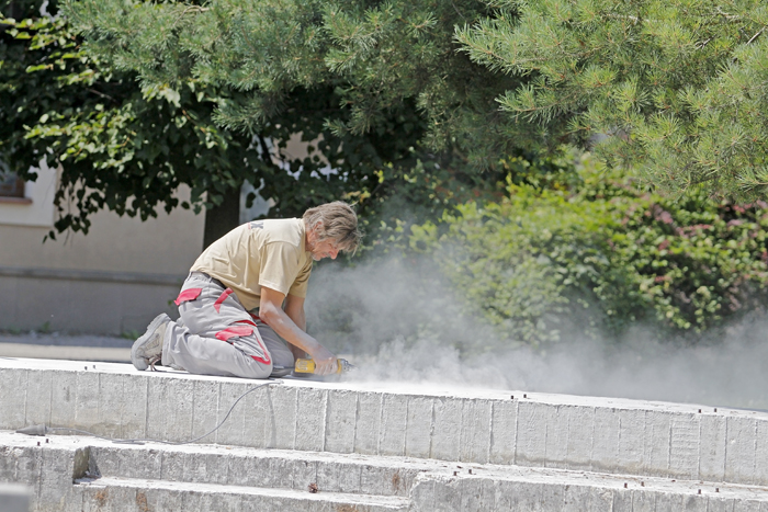 Vo štvrtok sme videli čistenie pohľadového betónového povrchu najvýznamnejšieho architektonického diela Dušana Kuzmu z roku 1969 od nečistôt a sprejových nápisov presvitajúcich spod predchádzajúcich náterov. Rovnako sa brúsi betónový povrch oválu okolo malej fontánky.