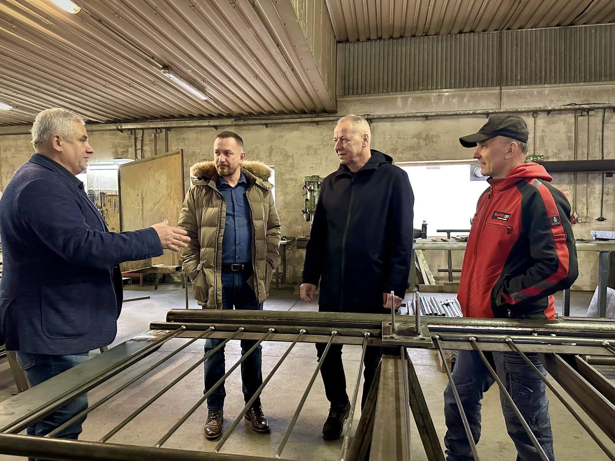 Ján Nosko a Jakub Gajdošík vo výrobnej hale pri erboch mesta