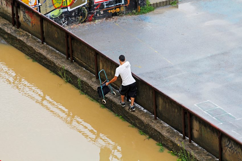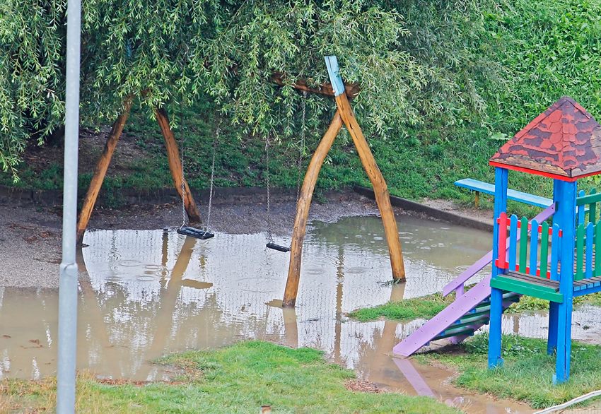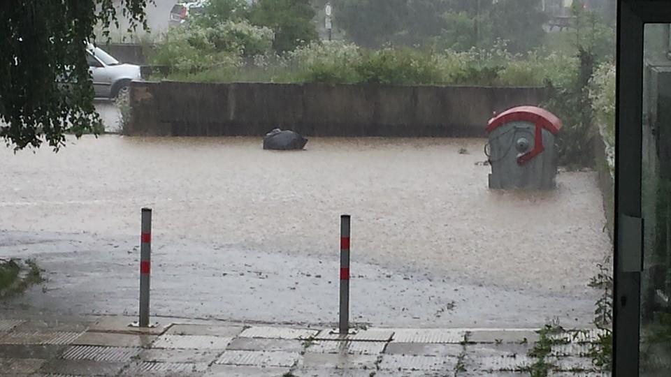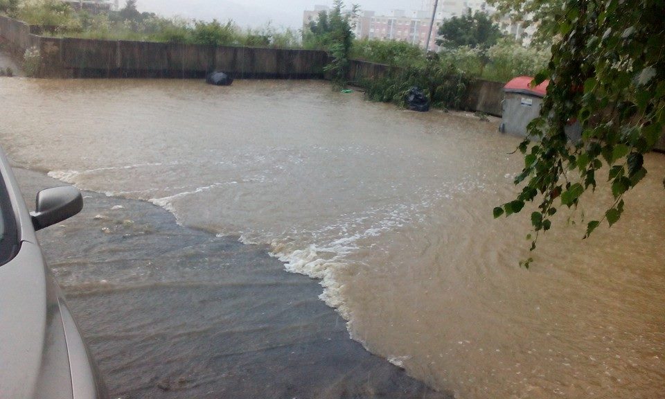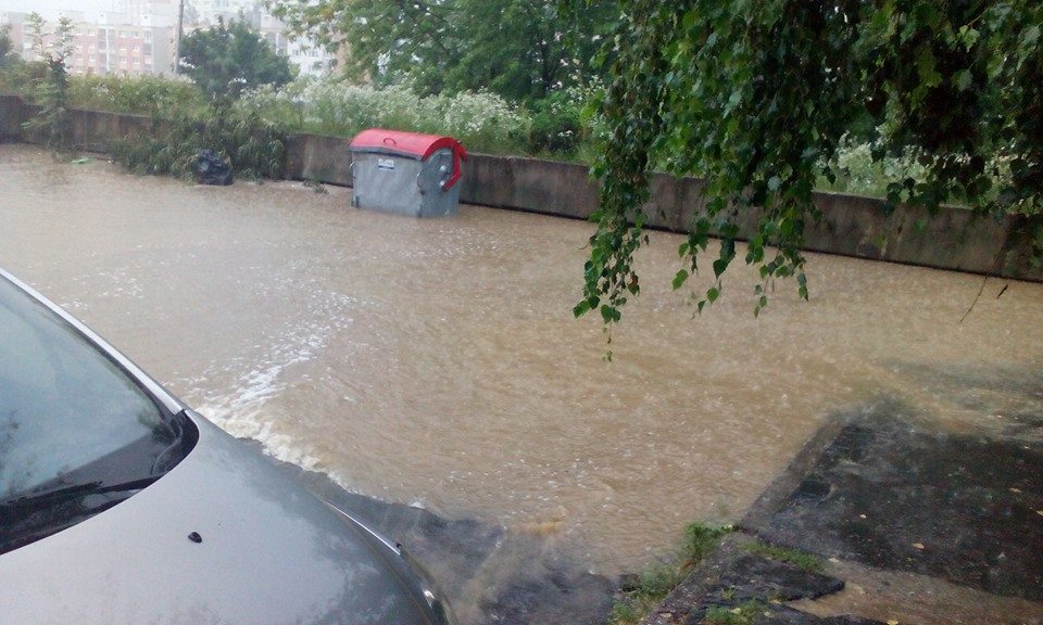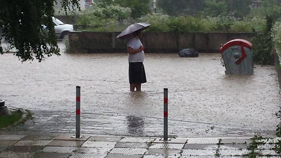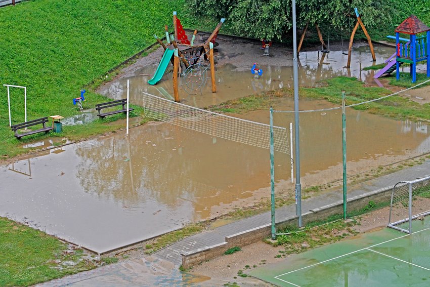 Od rána pomerne dusno a vlhko, popoludní sa priženú tmavé mračná od Panského dielu, ktoré sa za blýskania a hrmenia preháňajú najmä nad Sásovou. Množstvo vody, ktoré v krátkej dobe spadne na plochu sídliska, je obrovské. Nasiaknutá pôda ju nestačí absorbovať, bahno s naplaveným pieskom zanáša kanalizačné vpuste. Výsledok vidno na fotografiách.