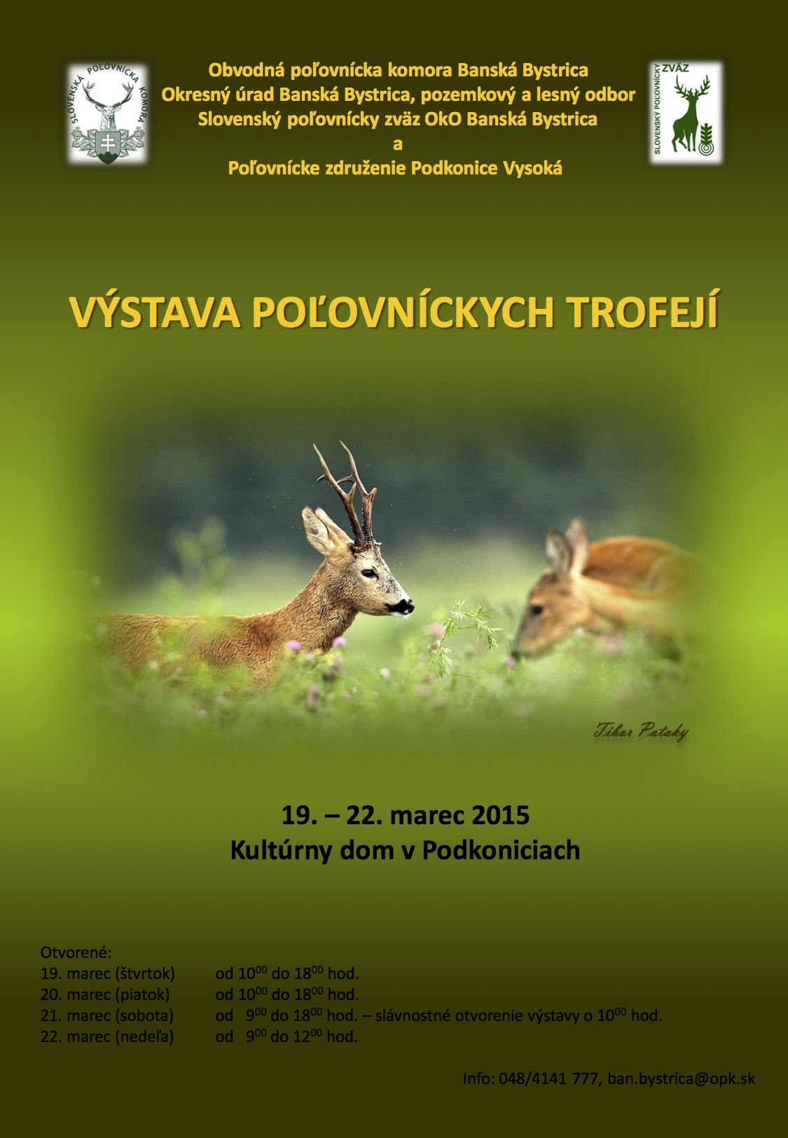 „Organizujeme túto akciu na popud predsedu miestneho poľovníckeho združenia Podkonice – Vysoká Ing. Jána Bobáka, ktorému sa takto podarilo splniť svoj dávny sen, aby to bolo v našej obci. Som nadšený z toho, ako sa dal pretvoriť kultúrny dom, v ktorom je táto unikátna výstava poľovníckych trofejí. Máme tu preparovaného medveďa, rysa, trofeje jeleňov i daniela. Hlavne pre nepoľovníkov je to veľký zážitok.“