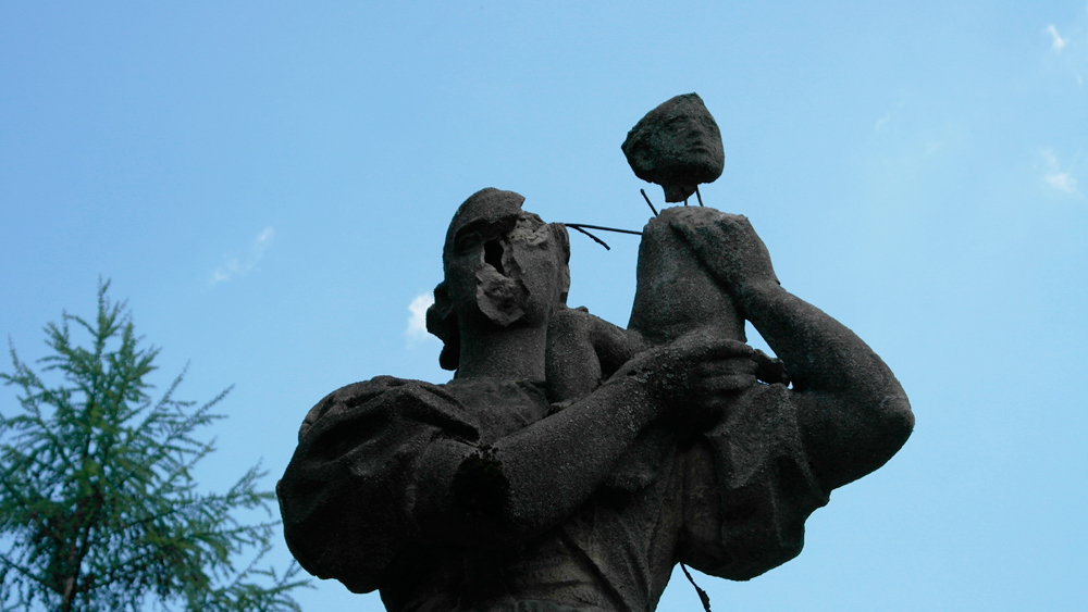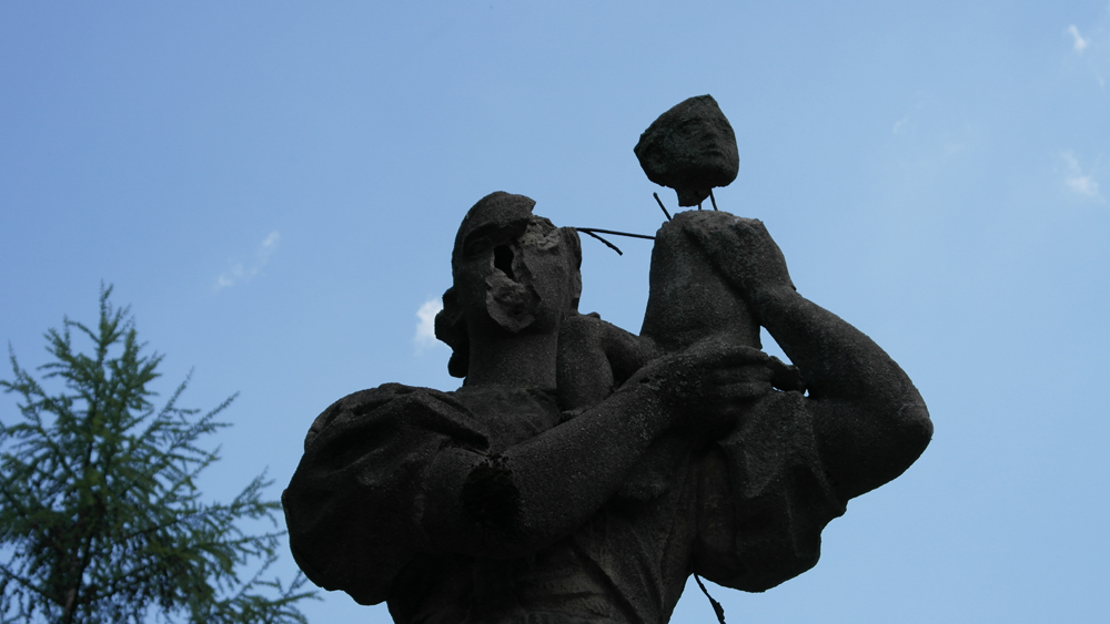 Zub času, ktorému asi niekto pomohol, na súsoší matky s dieťaťom takmer poodtŕhal hlavy...