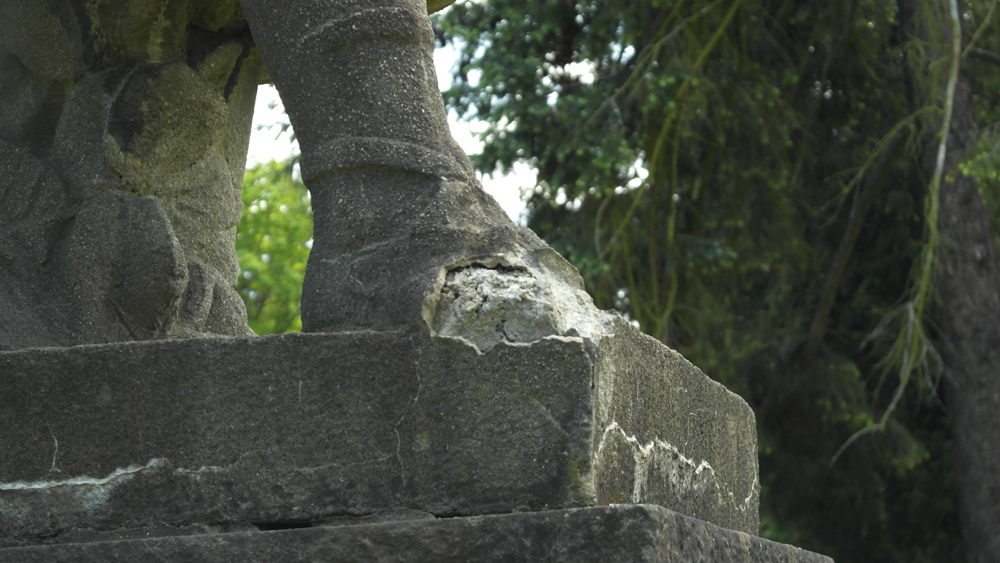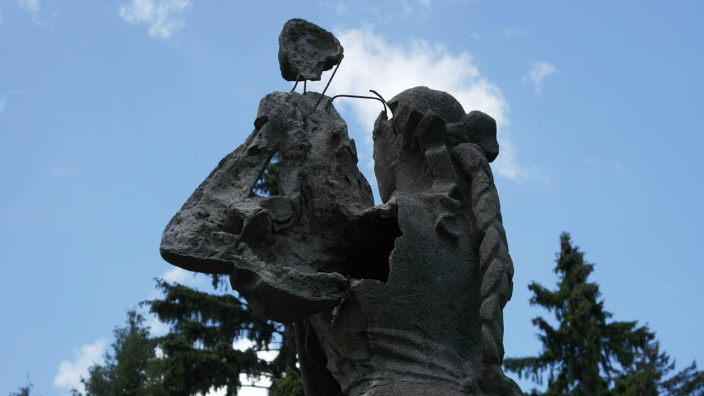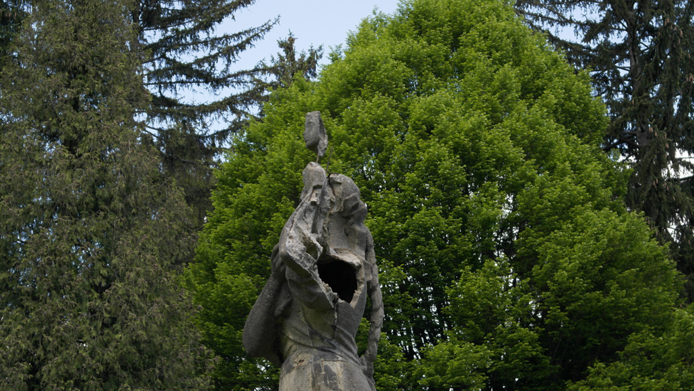 Smutne symbolický je stav sochy s týmto posolstvom.