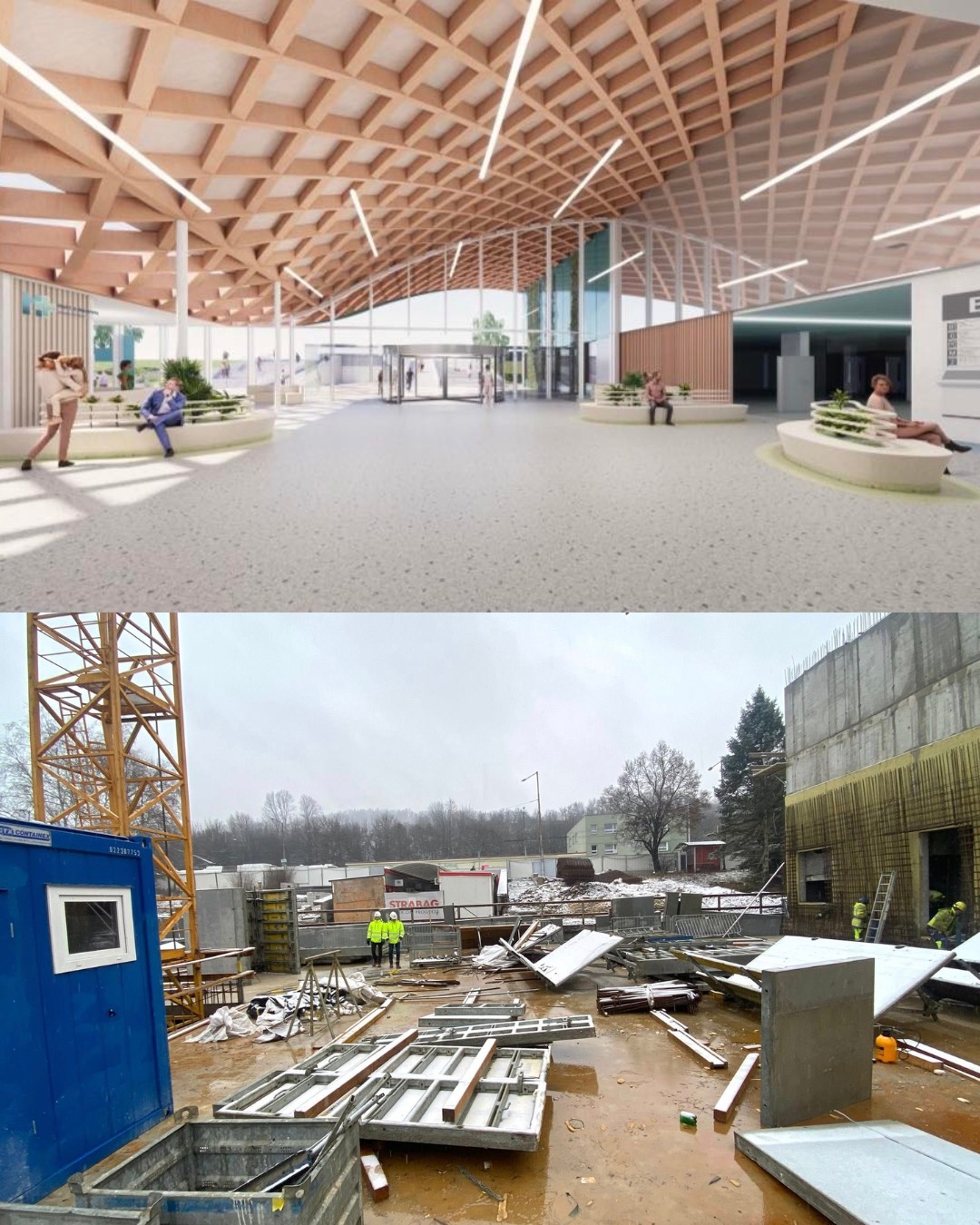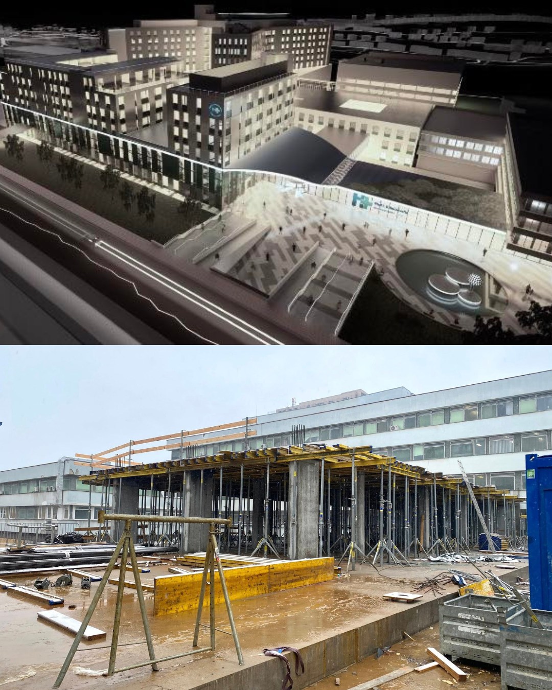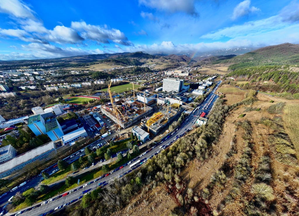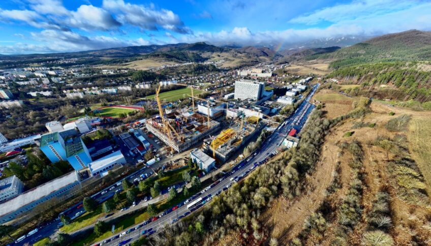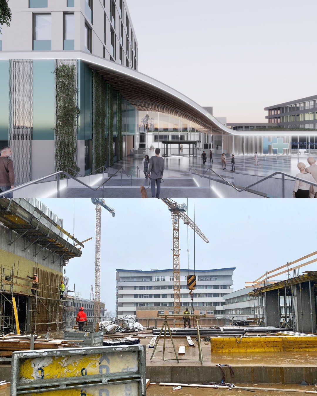 Každá dvojica záberov spája vizualizáciu s aktuálnou fotografiou. Môžete tak vidieť, ako sa pôvodné návrhy začínajú pretavovať do reálnych obrysov. Keďže v Banskej Bystrici je konečne pekné počasie, pripája nemocnica aj zopár slnečných pohľadov.