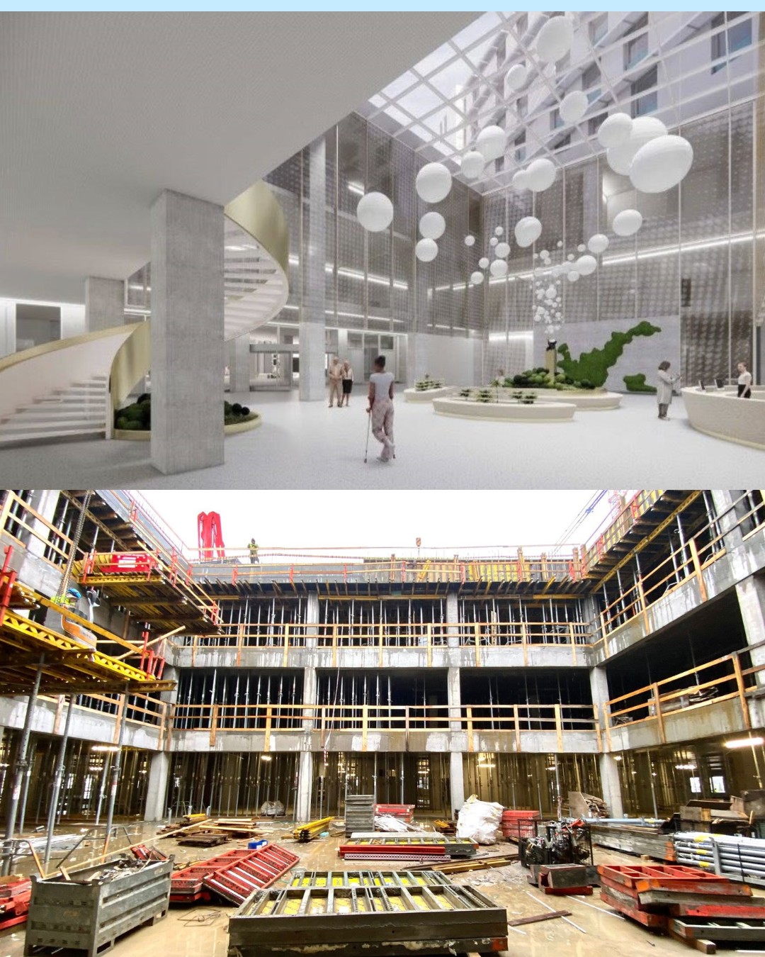 Dynamicky tvarovaný priestor s dominantným stropom v tvare vlny, množstvom zelene a prirodzeného svetla. Hlavné komunikačné trasy budú viesť „suchou nohou“ do polikliniky, detskej nemocnice, aj nových objektov nemocnice.
