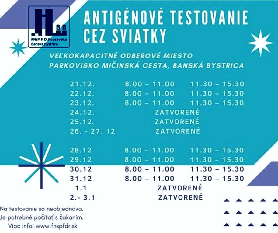 Rooseveltova nemocnica v Banskej Bystrici oznamuje, že antigénové testovanie na veľkokapacitnom odberovom mieste, Parkovisko Mičinská, Banská Bystrica bude v prevádzke aj medzi sviatkami.